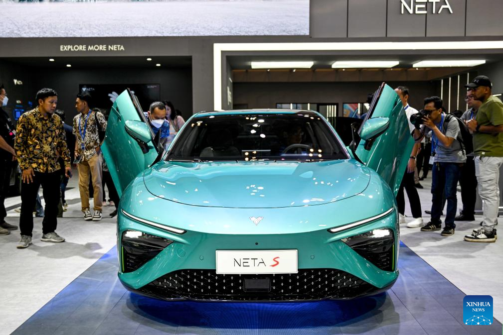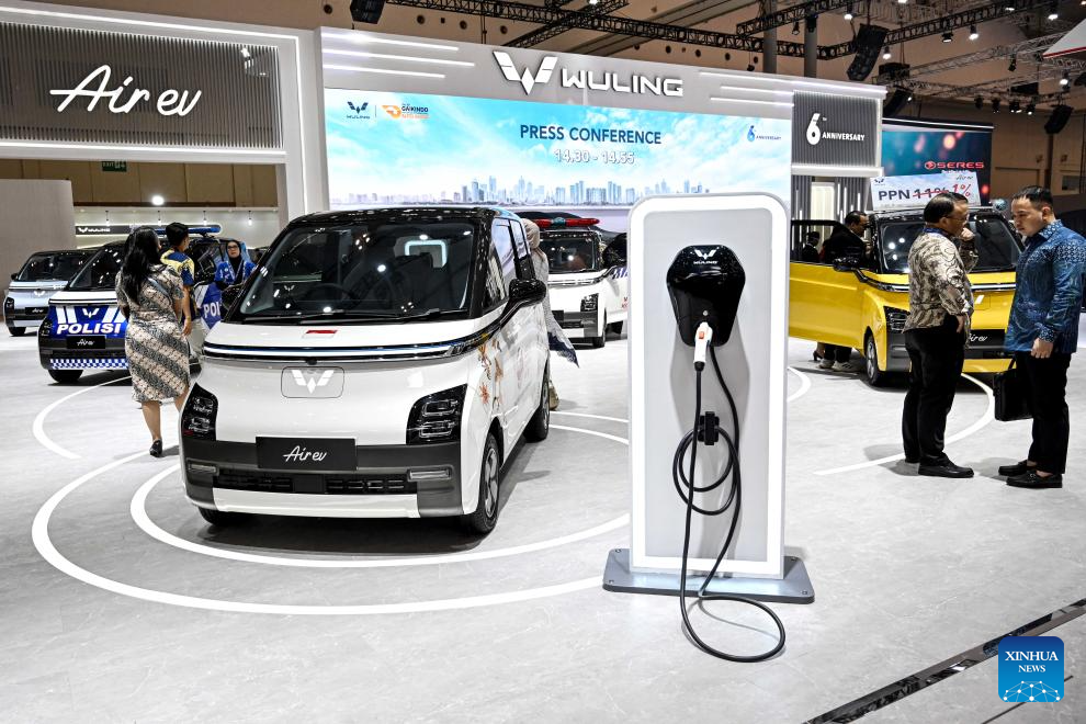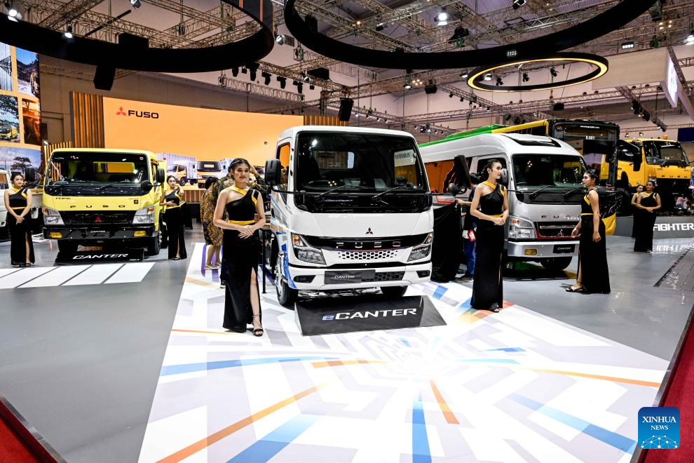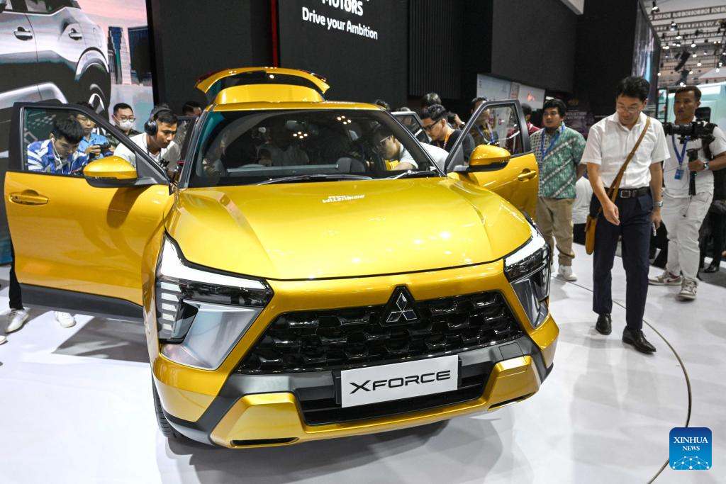 Visitors look at vehicles displayed at the GAIKINDO Indonesia International Auto Show (GIIAS) 2023 in Tangerang of Banten province, Indonesia, Aug. 10, 2023. The GIIAS 2023 opened here Thursday and will last till Aug. 20. (Xinhua/Agung Kuncahya B.)