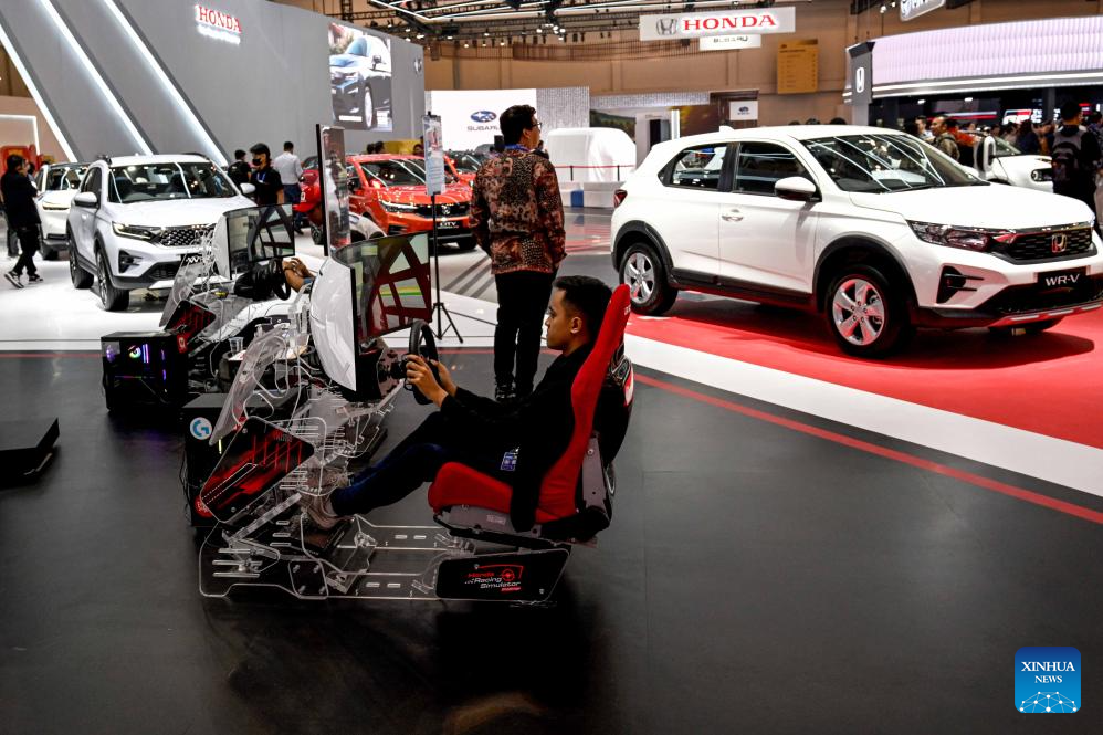 A visitor tries a driving simulator during the GAIKINDO Indonesia International Auto Show (GIIAS) 2023 in Tangerang of Banten province, Indonesia, Aug. 10, 2023. The GIIAS 2023 opened here Thursday and will last till Aug. 20. (Xinhua/Agung Kuncahya B.)