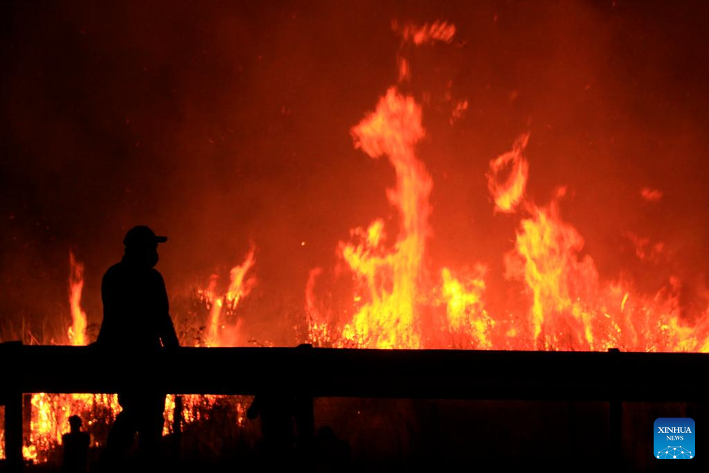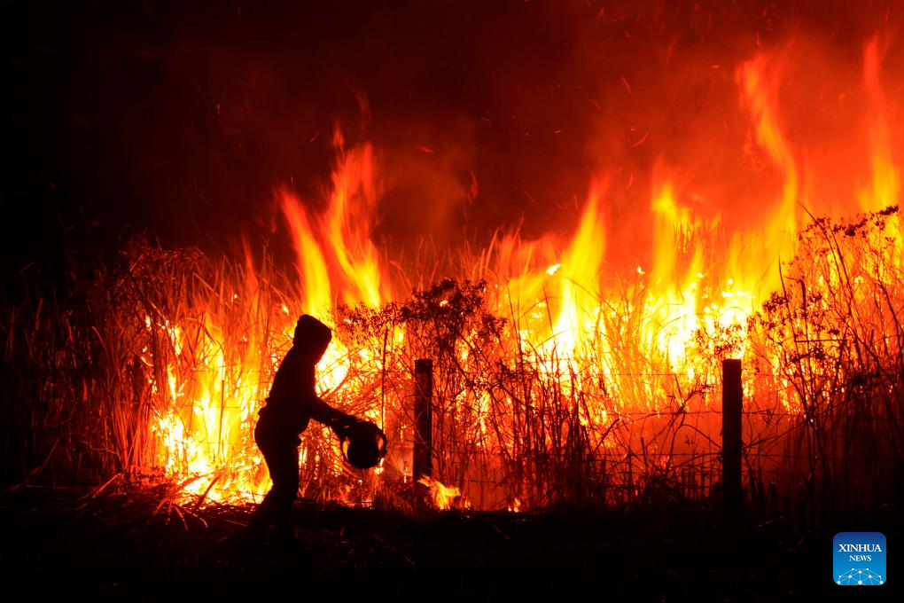 This photo taken on Aug. 17, 2023 shows a worker from toll road watching peatland fire at Pulau Negara village, South Sumatra, Indonesia. (Photo by M. Hatta/Xinhua)
