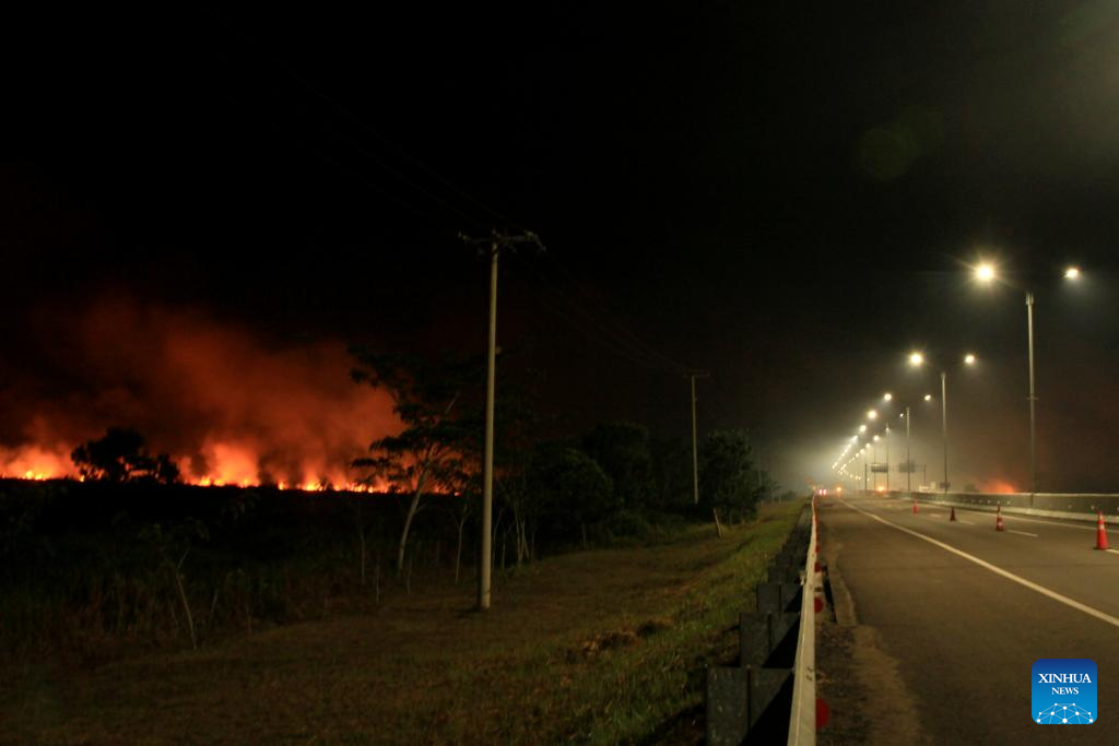 This photo taken on Aug. 17, 2023 shows a view of fire smoke near a toll road at Pulau Negara village, South Sumatra, Indonesia. (Photo by M. Hatta/Xinhua)