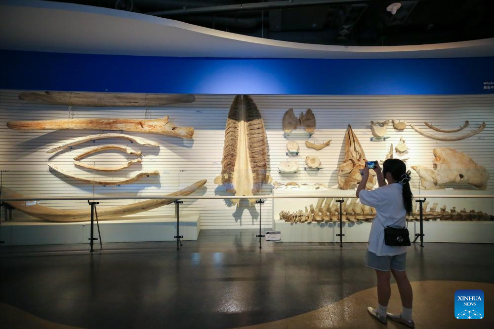 A visitor takes photos of whale specimens at Jangsaengpo Whale Museum in Ulsan, South Korea, Aug. 19, 2023. (Xinhua/Wang Yiliang)