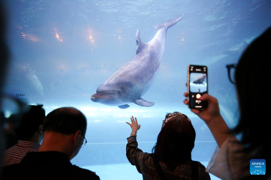People watch a dolphin at an aquarium of Jangsaengpo Whale Museum in Ulsan, South Korea, Aug. 18, 2023. (Xinhua/Wang Yiliang)