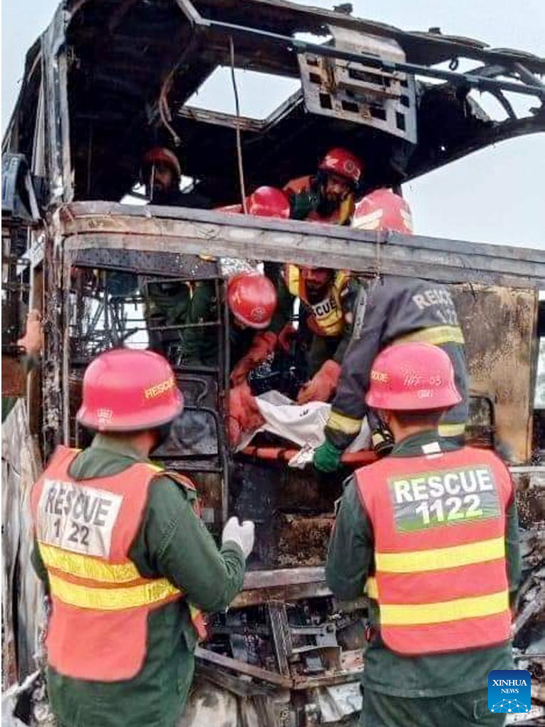 ISLAMABAD, Aug. 20 (Xinhua) -- At least 20 people were burnt to death and 15 others injured on Sunday after a passenger bus hit a vehicle and caught fire in Hafizabad district of Pakistan's eastern Punjab province, the rescue and health officials reported.