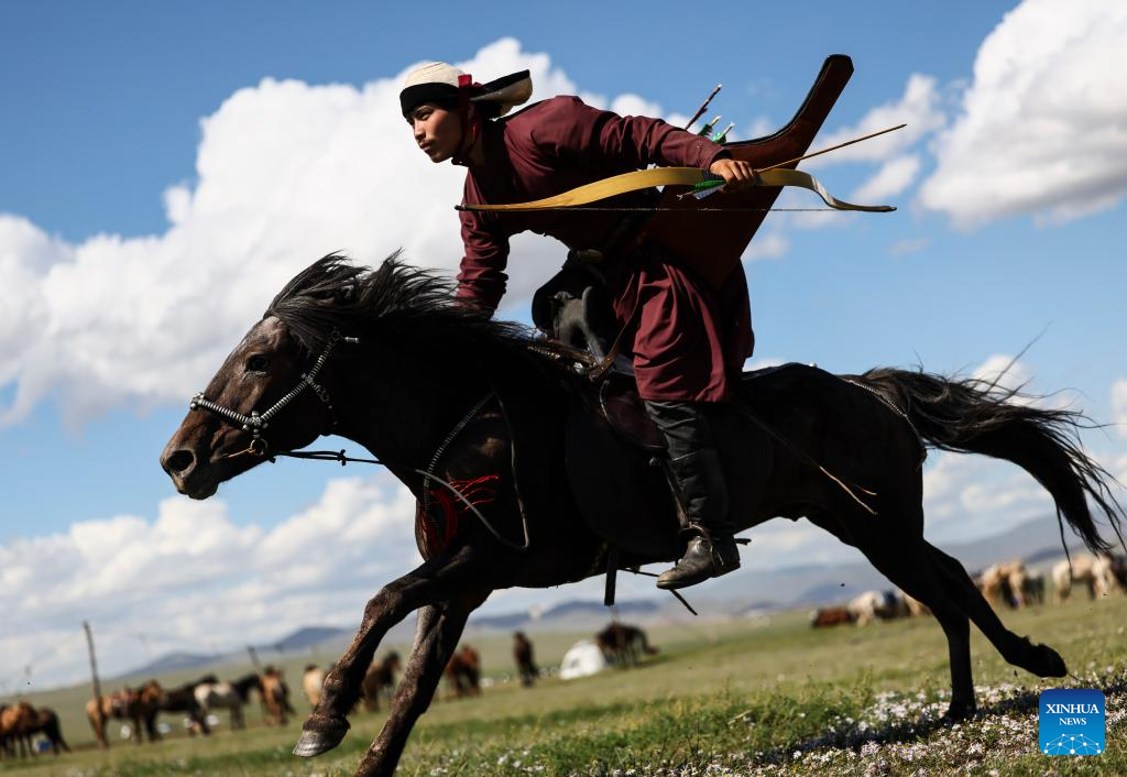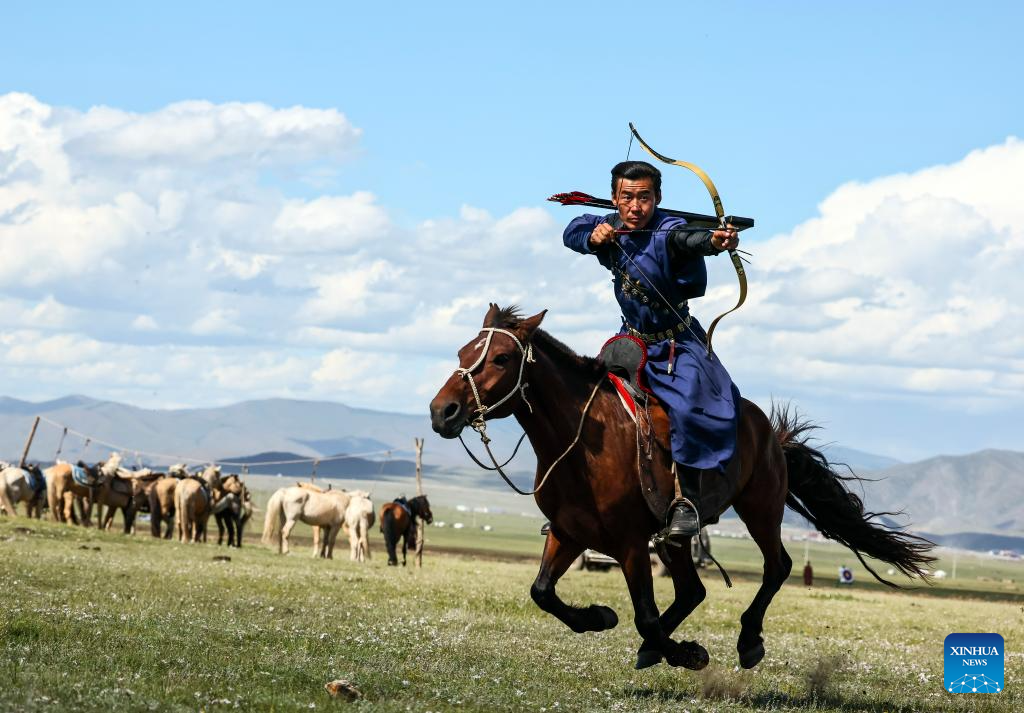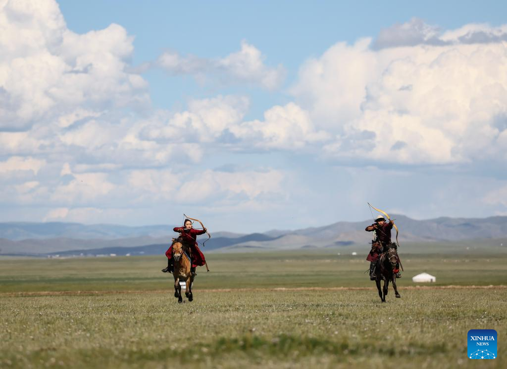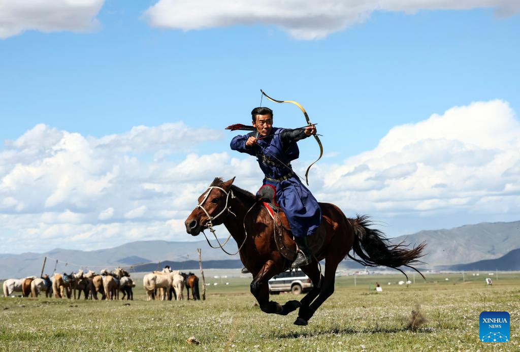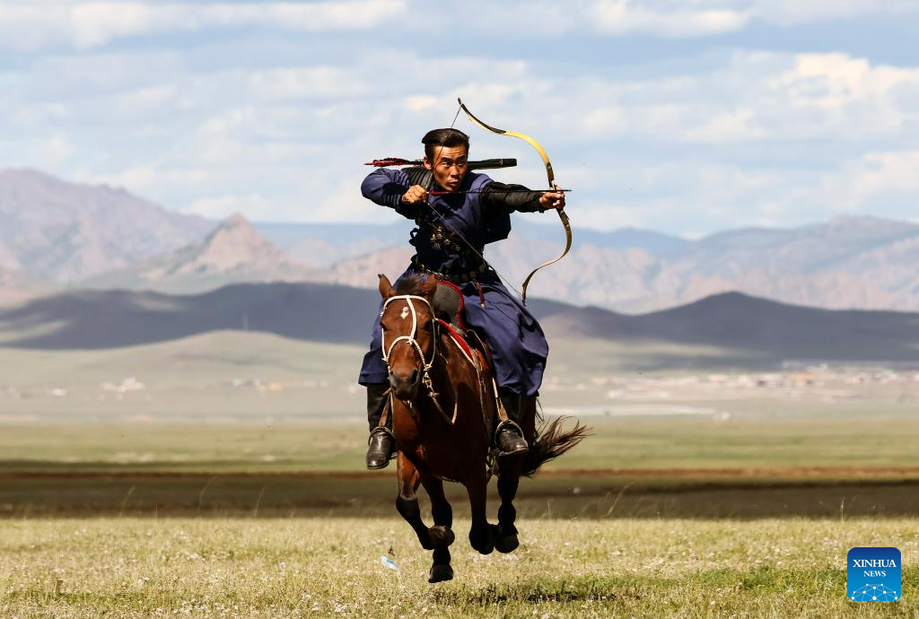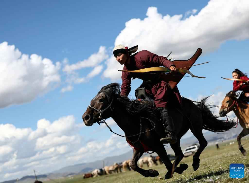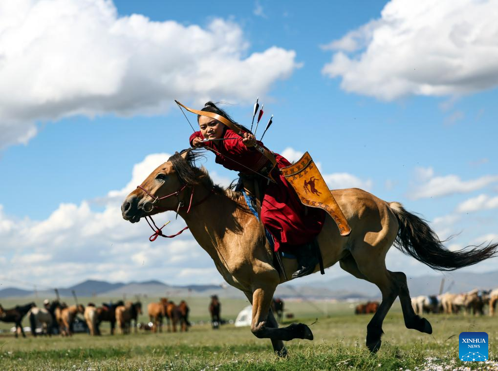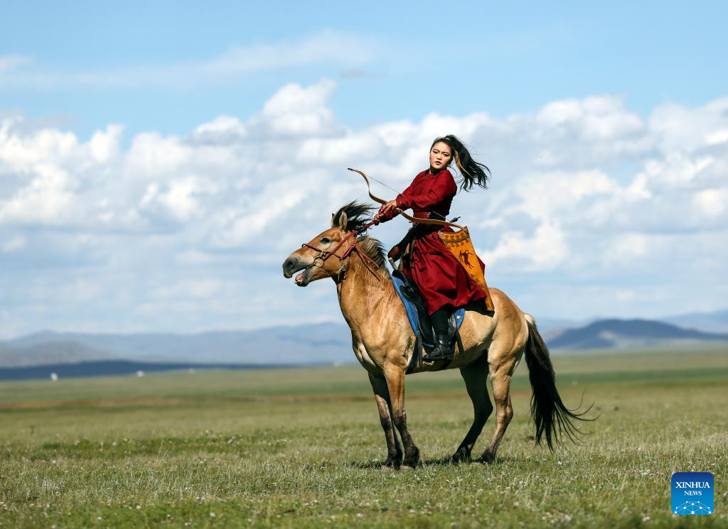 Participants perform riding and archery during a nomadic culture festival in the Nalaikh District of Ulan Bator, Mongolia, Aug. 19, 2023. A cultural festival to promote Mongolia's nomadic intangible culture and the development of the tourism sector was held from Aug. 18 to 20 in the Nalaikh District of Ulan Bator.