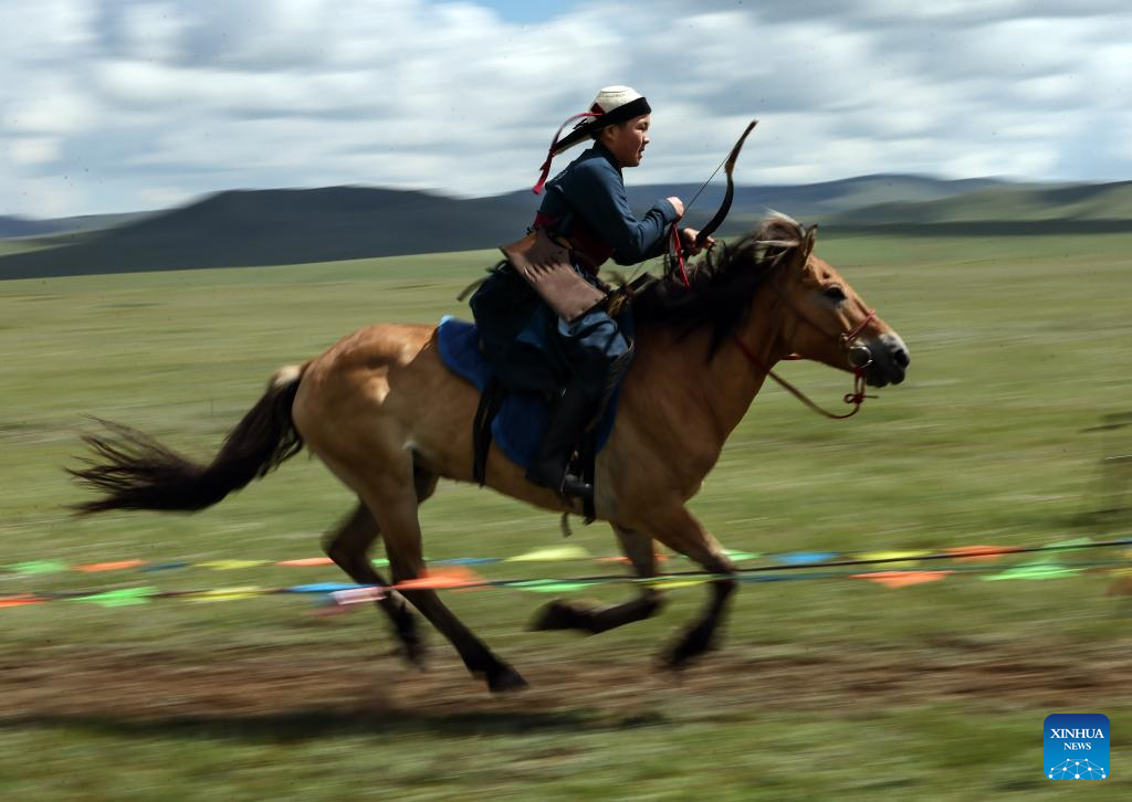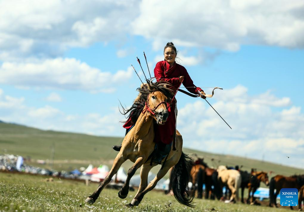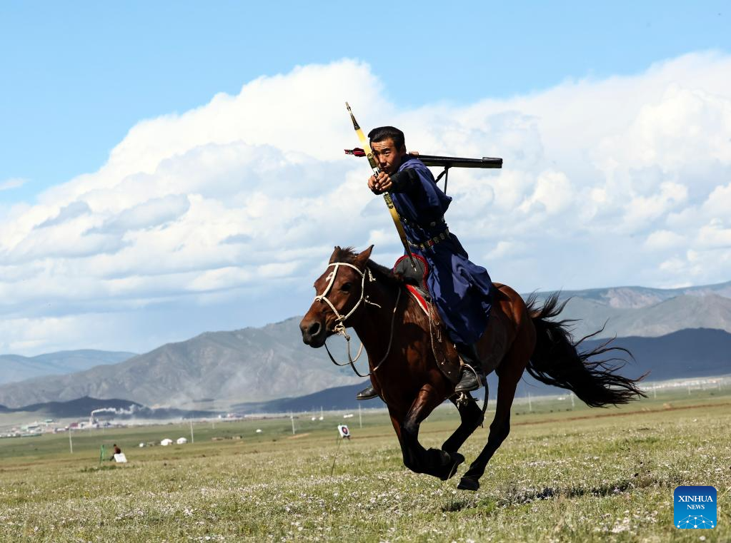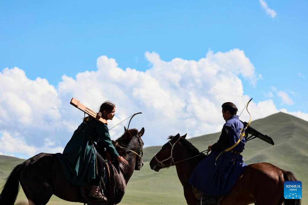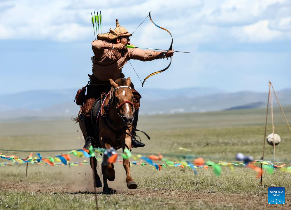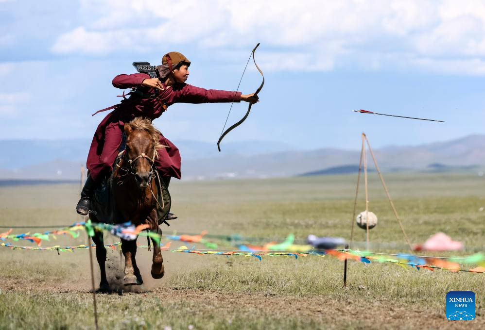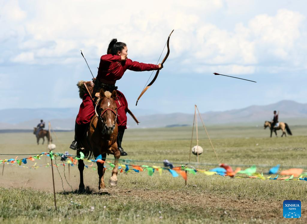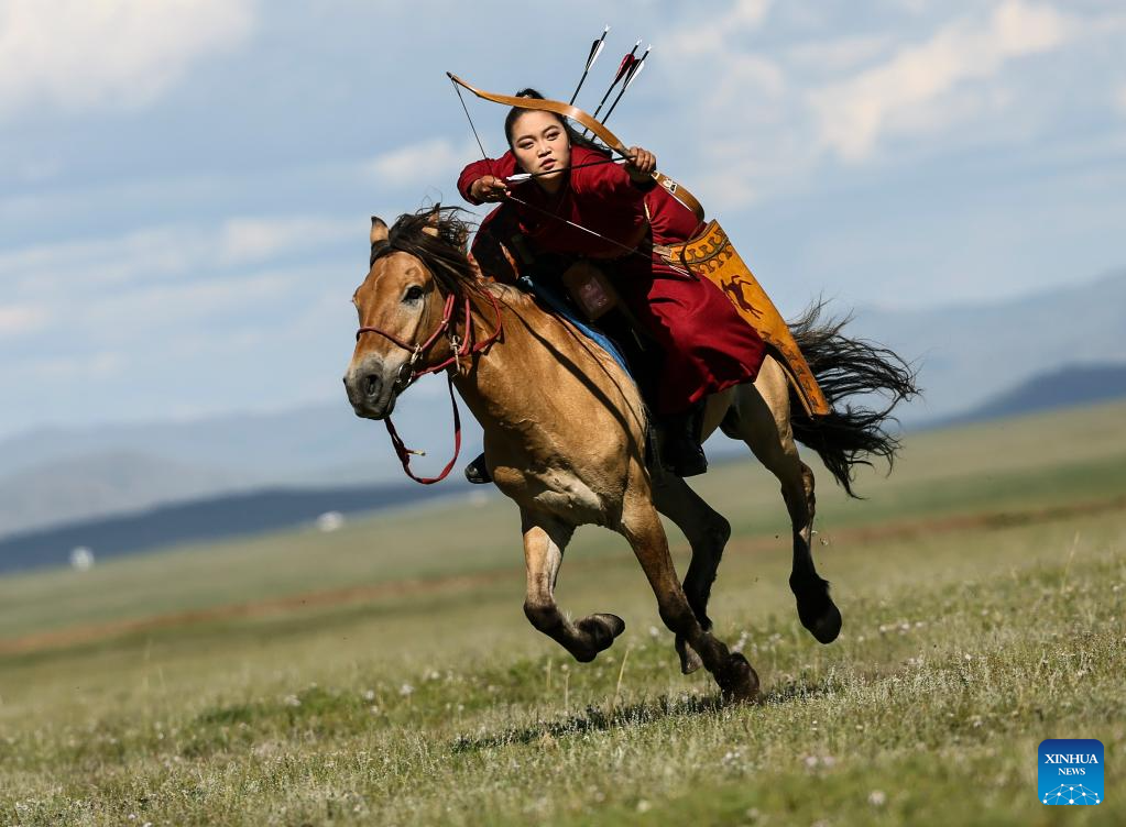 Participants perform riding and archery during a nomadic culture festival in the Nalaikh District of Ulan Bator, Mongolia, Aug. 19, 2023. A cultural festival to promote Mongolia's nomadic intangible culture and the development of the tourism sector was held from Aug. 18 to 20 in the Nalaikh District of Ulan Bator.