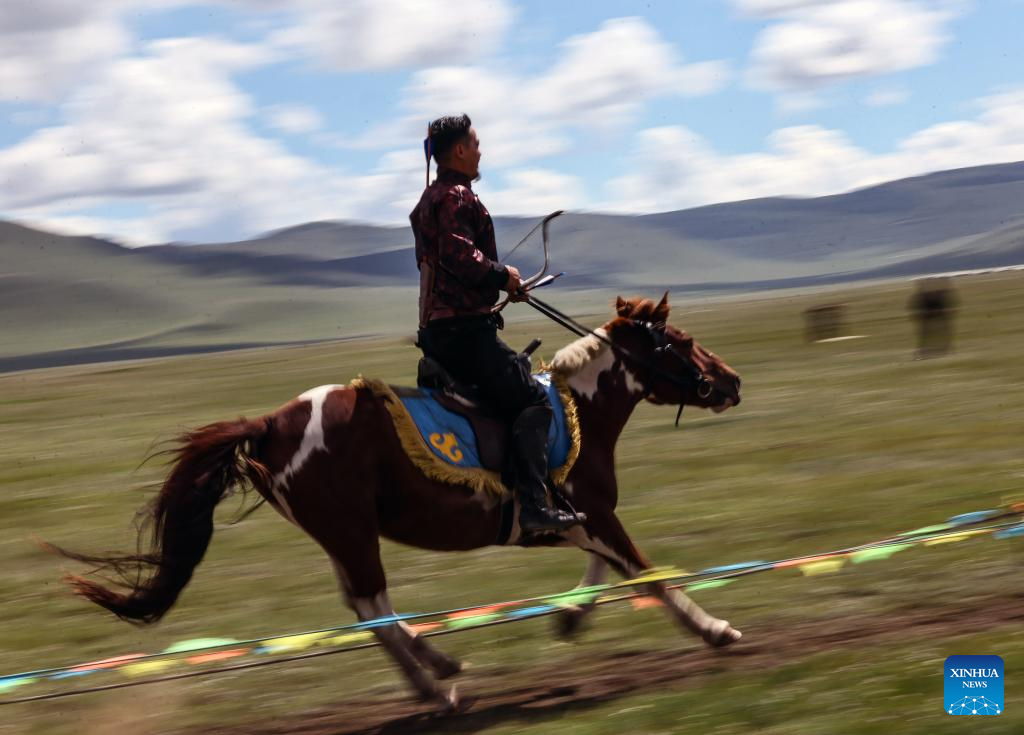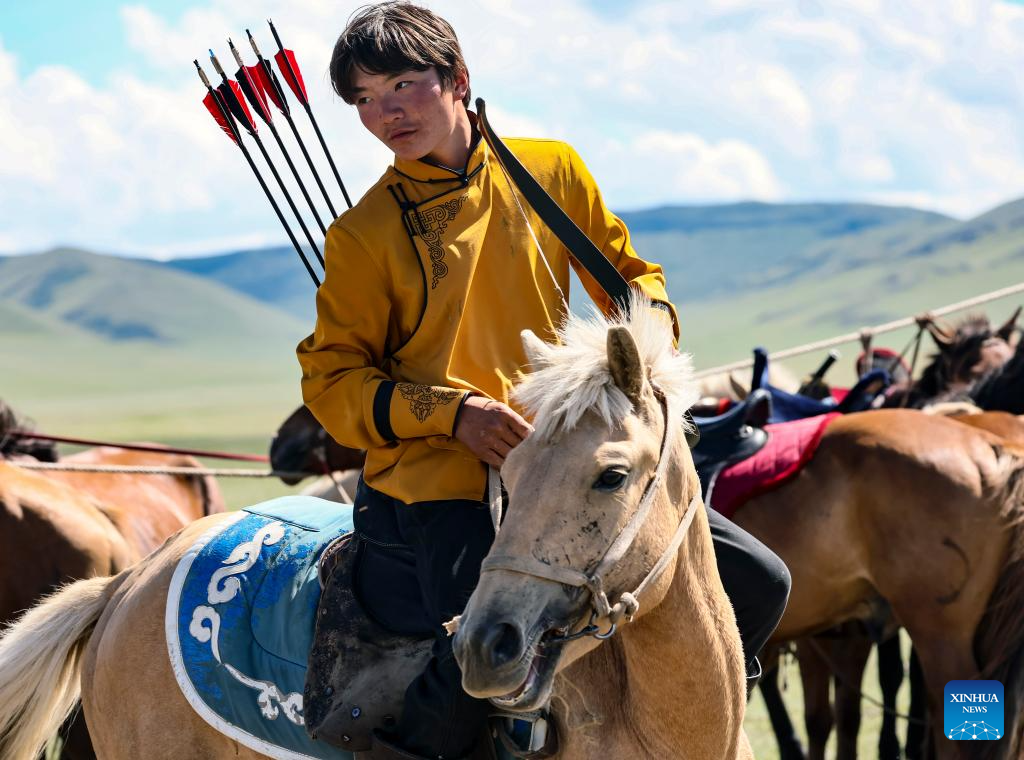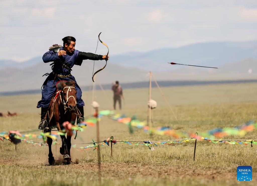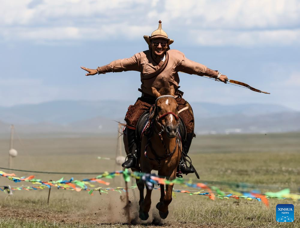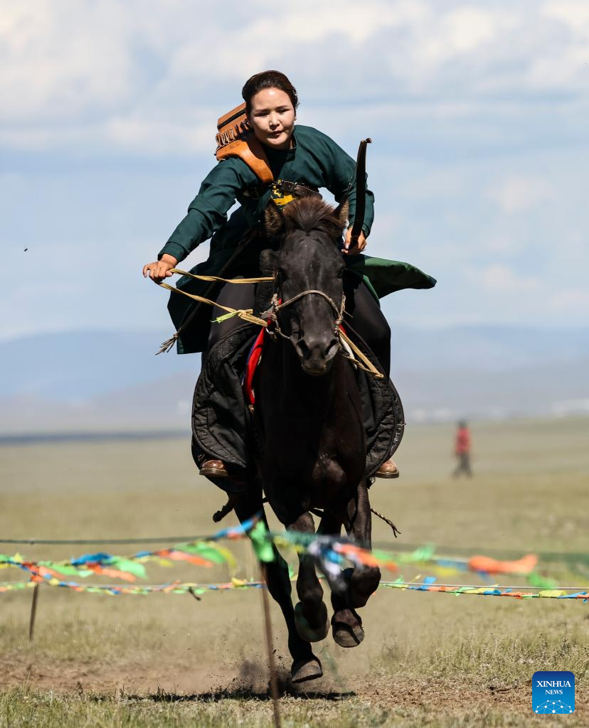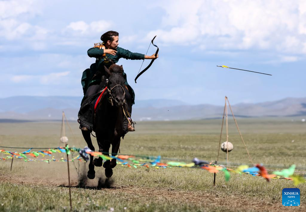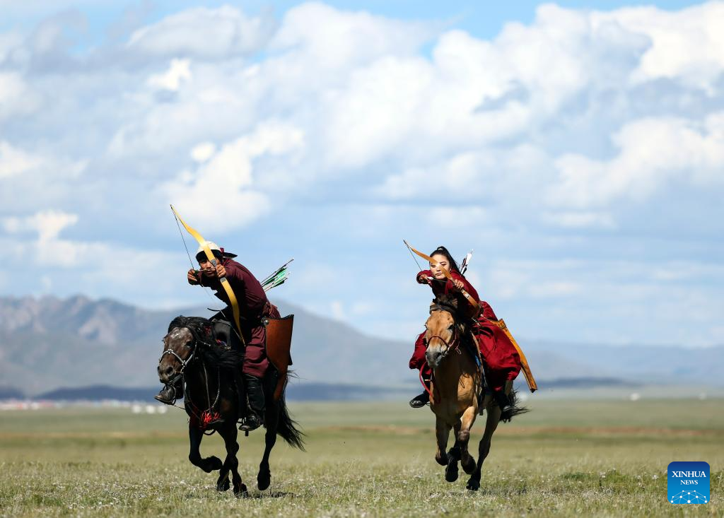 Participants perform riding and archery during a nomadic culture festival in the Nalaikh District of Ulan Bator, Mongolia, Aug. 19, 2023. A cultural festival to promote Mongolia's nomadic intangible culture and the development of the tourism sector was held from Aug. 18 to 20 in the Nalaikh District of Ulan Bator.