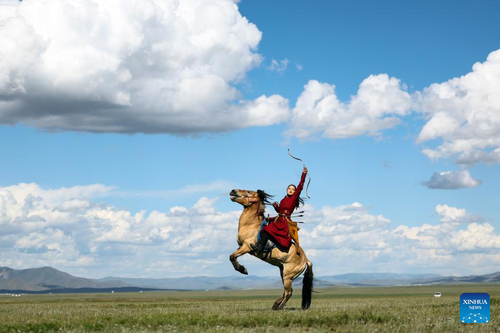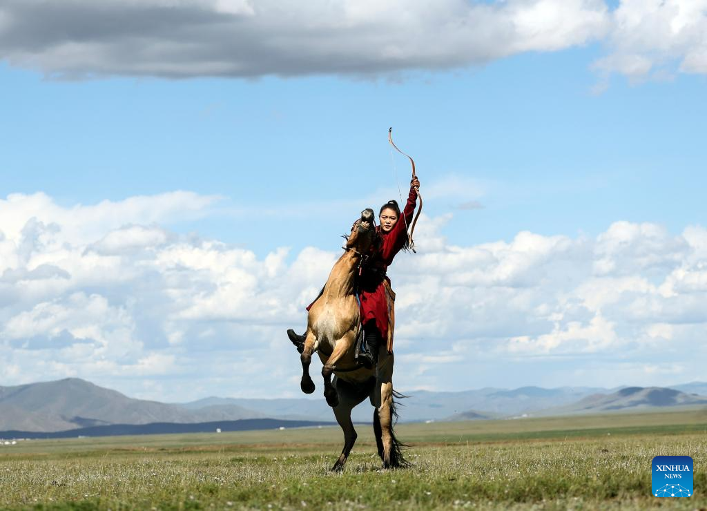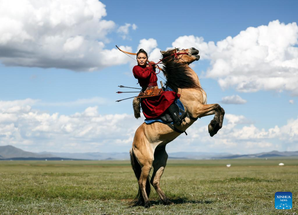 A horsewoman performs riding and archery during a nomadic culture festival in the Nalaikh District of Ulan Bator, Mongolia, Aug. 19, 2023. A cultural festival to promote Mongolia's nomadic intangible culture and the development of the tourism sector was held from Aug. 18 to 20 in the Nalaikh District of Ulan Bator.