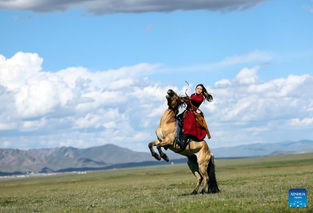 A horsewoman participates in a horsemanship performance during a nomadic culture festival in the Nalaikh District of Ulan Bator, Mongolia, Aug. 19, 2023. A cultural festival to promote Mongolia's nomadic intangible culture and the development of the tourism sector was held from Aug. 18 to 20 in the Nalaikh District of Ulan Bator.