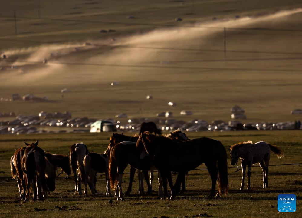 Horses are pictured at twilight in the Nalaikh District of Ulan Bator, Mongolia, Aug. 19, 2023. A cultural festival to promote Mongolia's nomadic intangible culture and the development of the tourism sector was held from Aug. 18 to 20 in the Nalaikh District of Ulan Bator.