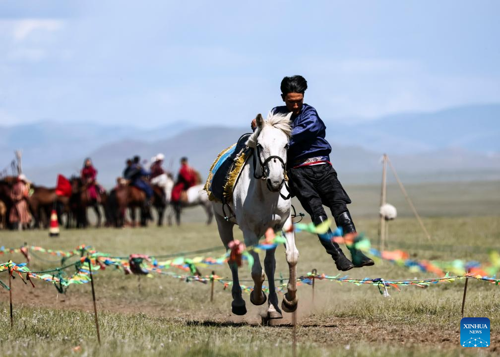 A horseman participates in a horsemanship performance during a nomadic culture festival in the Nalaikh District of Ulan Bator, Mongolia, Aug. 18, 2023. A cultural festival to promote Mongolia's nomadic intangible culture and the development of the tourism sector was held from Aug. 18 to 20 in the Nalaikh District of Ulan Bator.