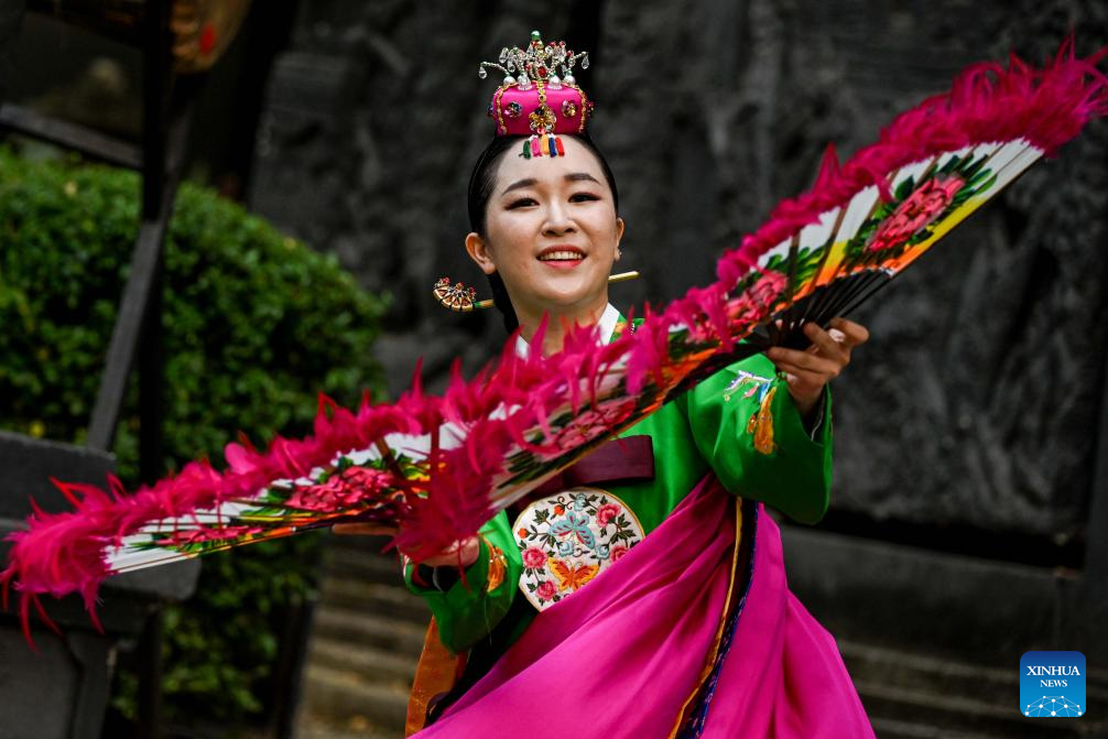 A South Korean dancer performs traditional folk dance during the South Tangerang International Music and Dance Folklore Festival at RBN Puspo Budoyo in South Tangerang, Banten province, Indonesia, on Aug. 23, 2023. (Xinhua/Agung Kuncahya B.)