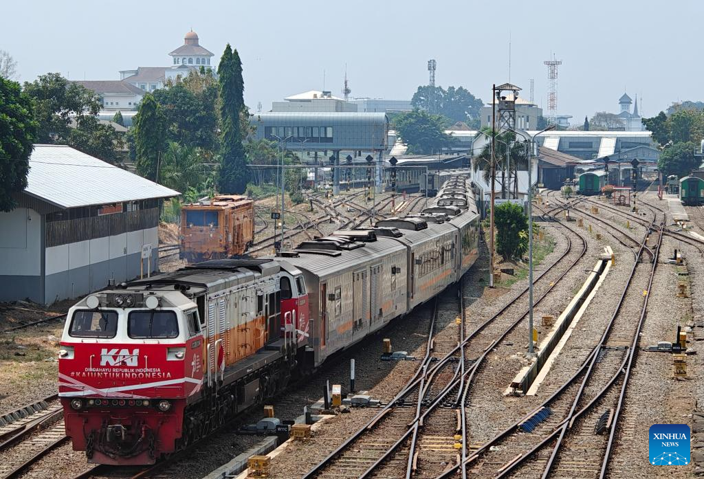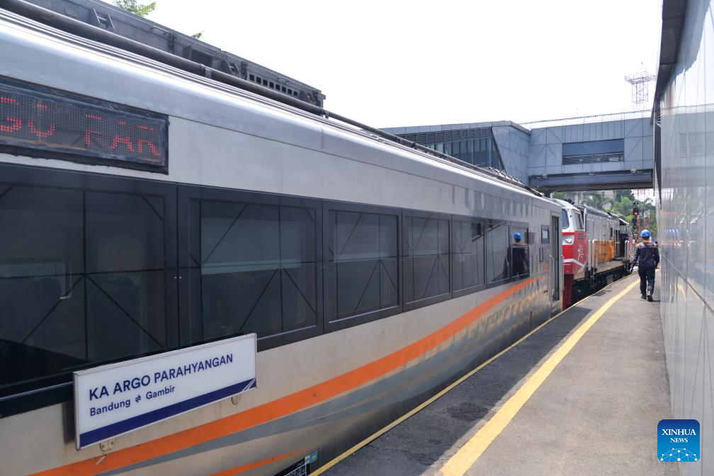 A train from Jakarta stops at Bandung Station in Bandung, Indonesia, Aug. 27, 2023. (Xinhua/Xu Qin)