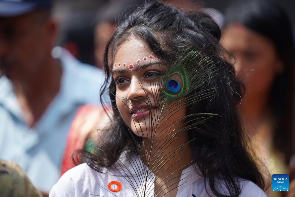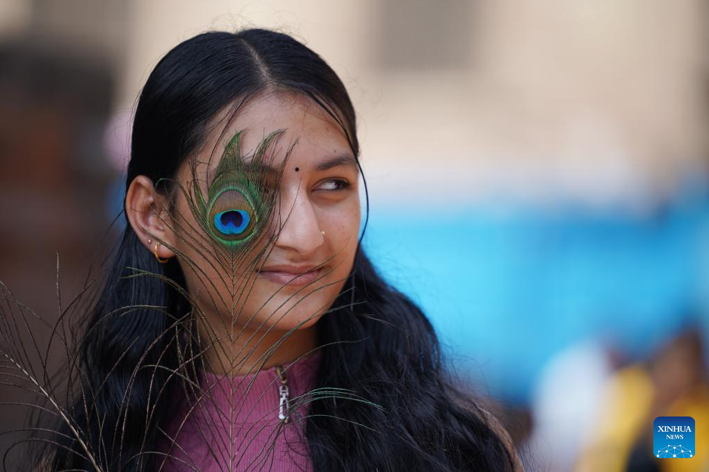 A girl poses for photos with a peacock feather in hand during the Krishna Janmashtami festival in Lalitpur, Nepal, Sept. 6, 2023. Krishna Janmashtami festival is celebrated annually to mark the birth anniversary of Hindu God Krishna. (Photo by Hari Maharjan/Xinhua)
