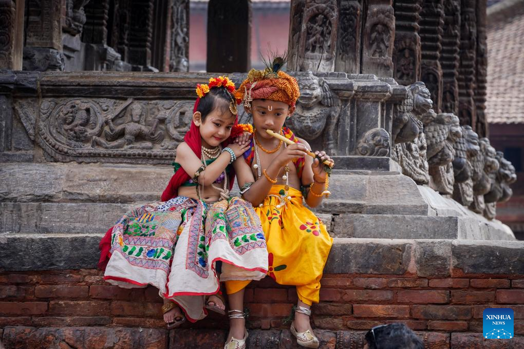 A boy and a girl dressed as Lord Krishna and Goddess Radha pose for photos during the Krishna Janmashtami festival in Lalitpur, Nepal, Sept. 6, 2023. Krishna Janmashtami festival is celebrated annually to mark the birth anniversary of Hindu God Krishna. (Photo by Hari Maharjan/Xinhua)