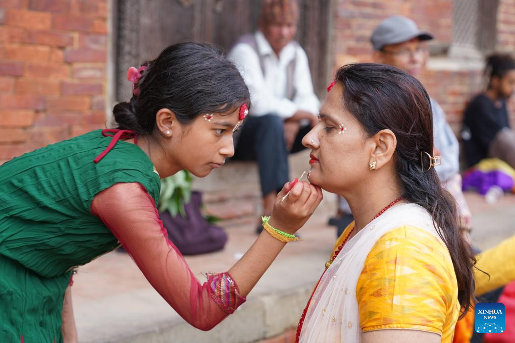 A devotee has her face decorated during the Krishna Janmashtami festival in Lalitpur, Nepal, Sept. 6, 2023. Krishna Janmashtami festival is celebrated annually to mark the birth anniversary of Hindu God Krishna. (Photo by Hari Maharjan/Xinhua)