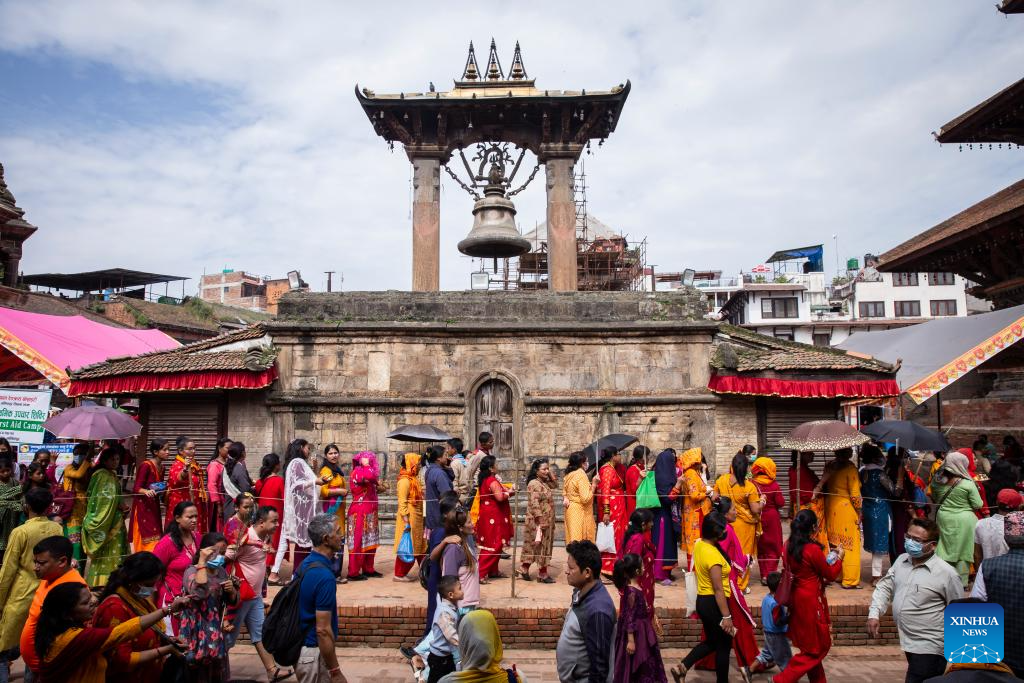 Devotees line up to worship Lord Krishna at a Krishna temple during the Krishna Janmashtami festival in Lalitpur, Nepal, Sept. 6, 2023. Krishna Janmashtami festival is celebrated annually to mark the birth anniversary of Hindu God Krishna. (Photo by Hari Maharjan/Xinhua)