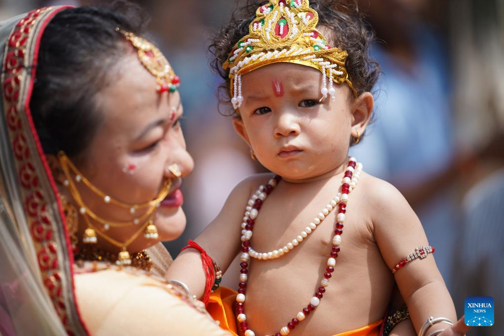 A woman holds a boy dressed as Lord Krishna during the Krishna Janmashtami festival in Lalitpur, Nepal, Sept. 6, 2023. Krishna Janmashtami festival is celebrated annually to mark the birth anniversary of Hindu God Krishna. (Photo by Hari Maharjan/Xinhua)