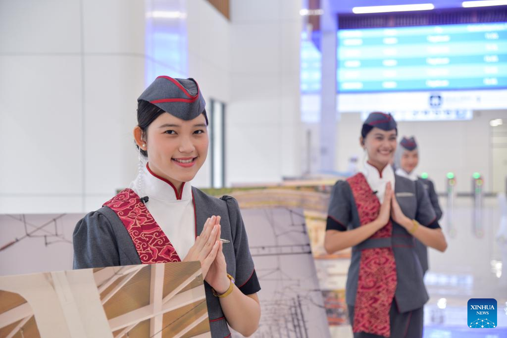 Crew members welcome guests who are about to board a train of Jakarta-Bandung High-Speed Railway to go to Bandung in Halim Station, Jakarta, Indonesia, Sept. 9, 2023. The opening ceremony of the Jakarta-Bandung High-Speed Railway (HSR) Electric Multiple Unit (EMU) Educational and Cultural Exchange Base, along with the first Open Day for Rail Enthusiasts event, was held in Indonesia's Bandung on Saturday.