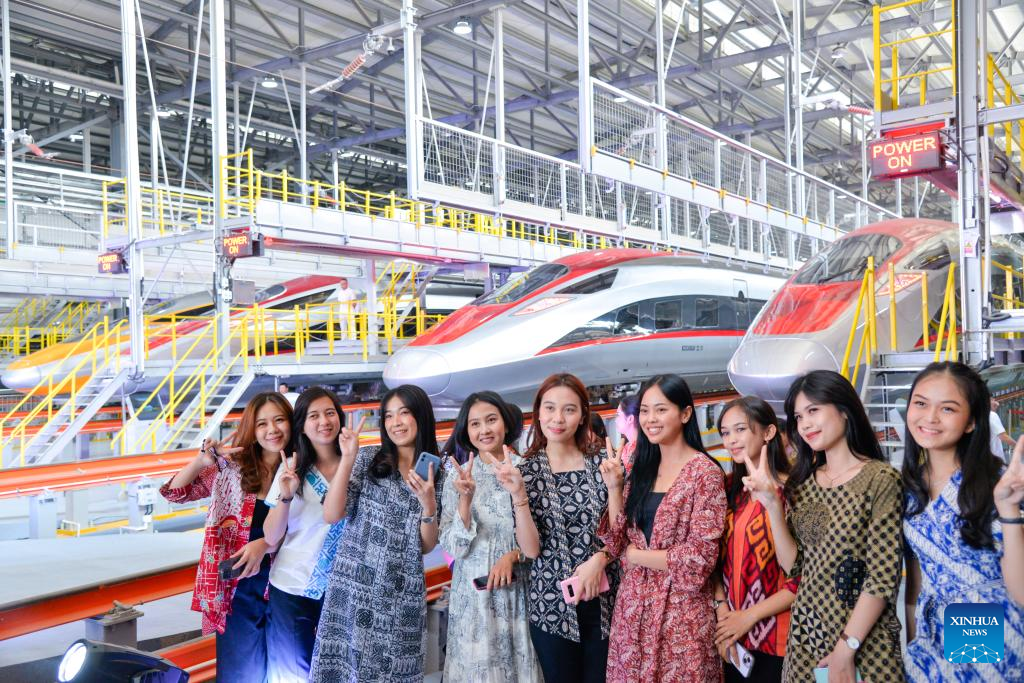 Nearly 500 people, including railway enthusiasts and students from across Indonesia, attended the event, which was the first occasion for Indonesian people to step inside the train maintenance facility of the Jakarta-Bandung HSR and observe the EMUs up close. (Xinhua/Xu Qin)