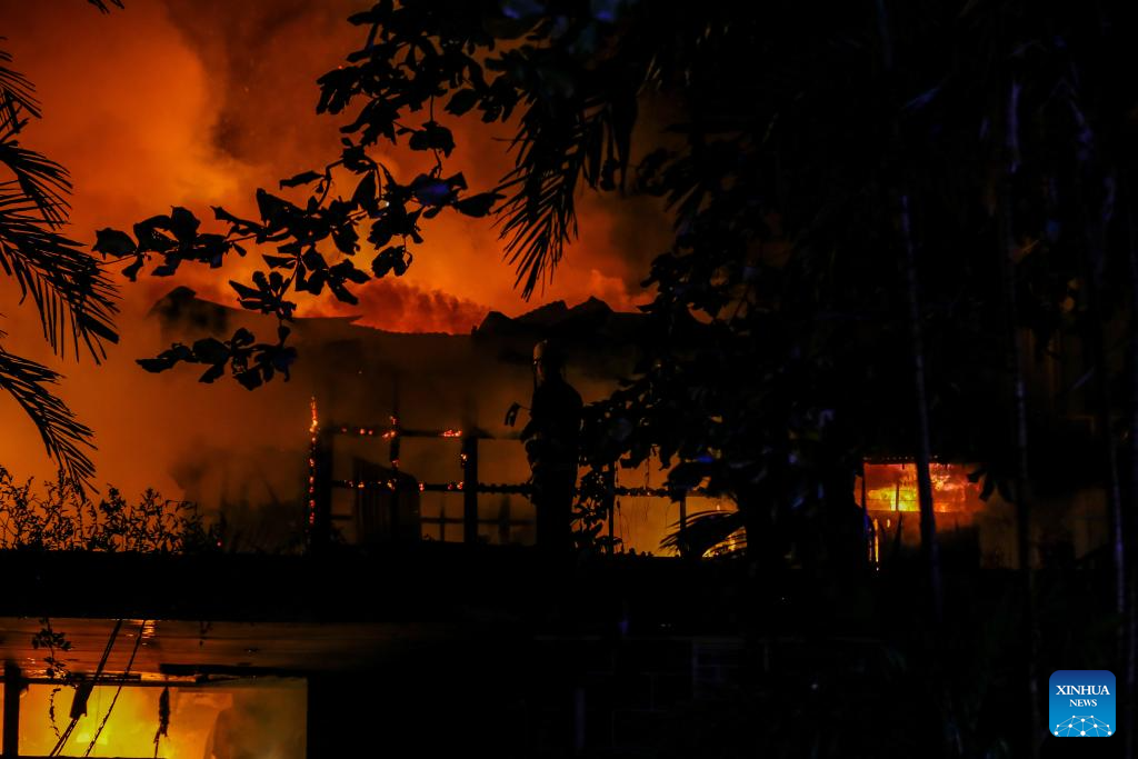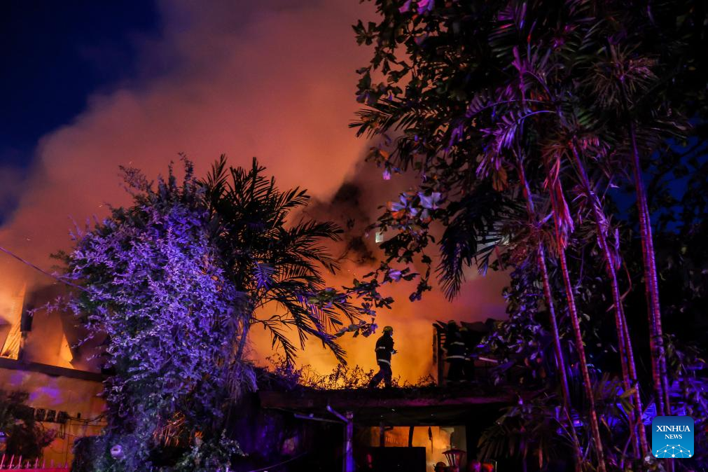 A firefighter tries to put out a house fire in Quezon City, the Philippines on Sept. 11, 2023. (Xinhua/Rouelle Umali)