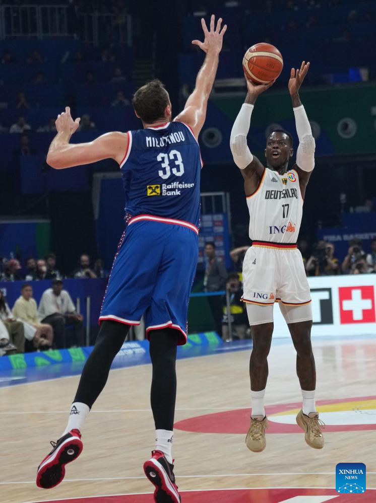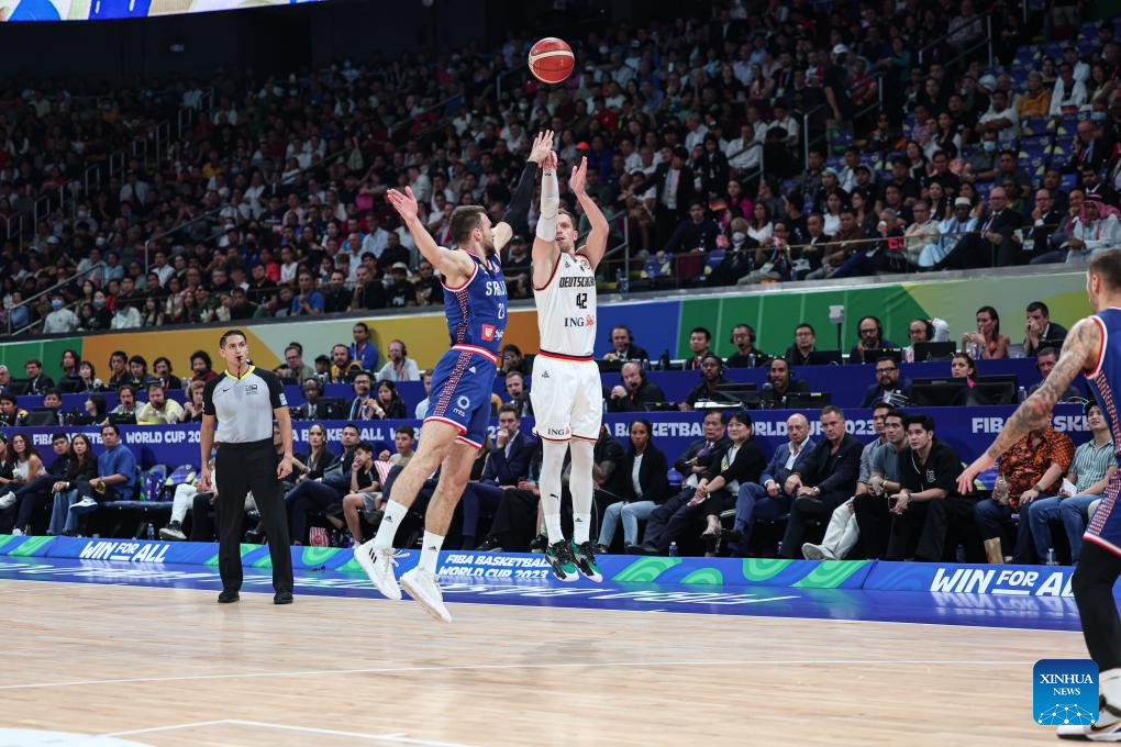 Andreas Obst (R) of Germany shoots during the final between Germany and Serbia at the 2023 FIBA World Cup in Manila, the Philippines, Sept. 10, 2023. (Xinhua/Wu Zhuang)