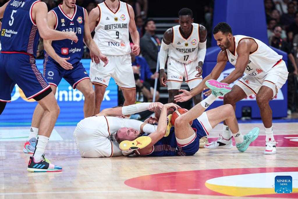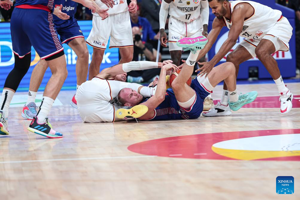 Dejan Davidovac (bottom R) of Serbia and Moritz Wagner (bottom L) of Germany vie for the ball during the final between Germany and Serbia at the 2023 FIBA World Cup in Manila, the Philippines, Sept. 10, 2023. (Xinhua/Wu Zhuang)