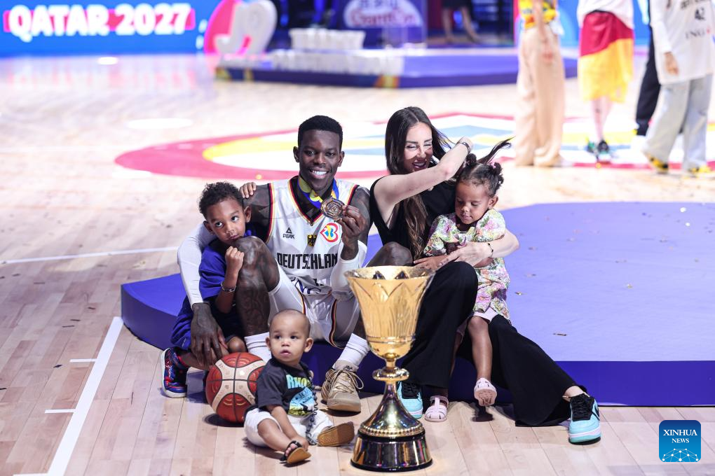Dennis Schroder of Germany poses for a family photo after the awarding ceremony following the final between Germany and Serbia at the 2023 FIBA World Cup in Manila, the Philippines, Sept. 10, 2023. (Xinhua/Wu Zhuang)