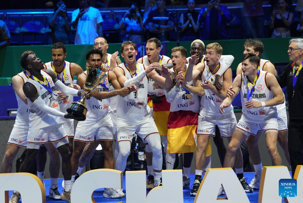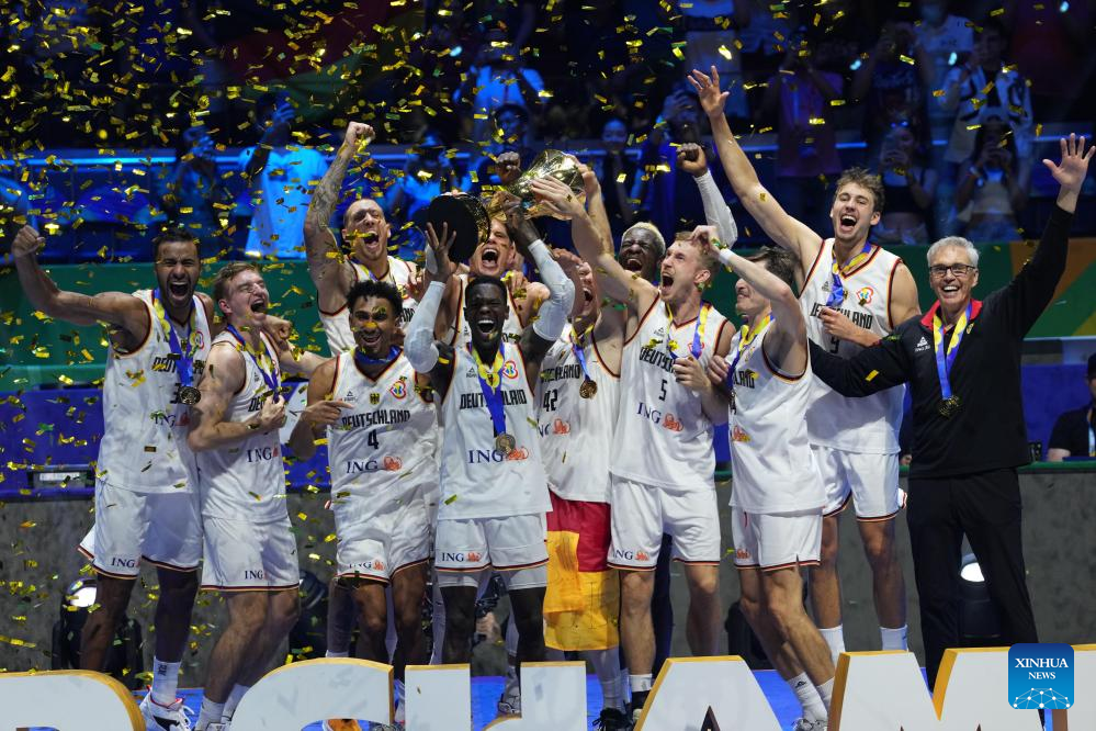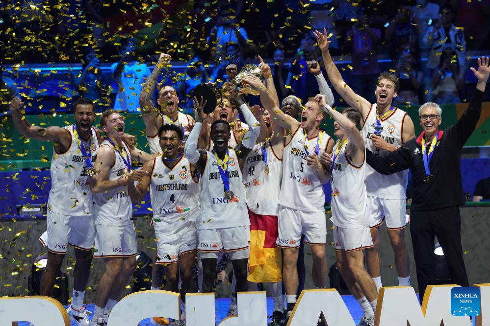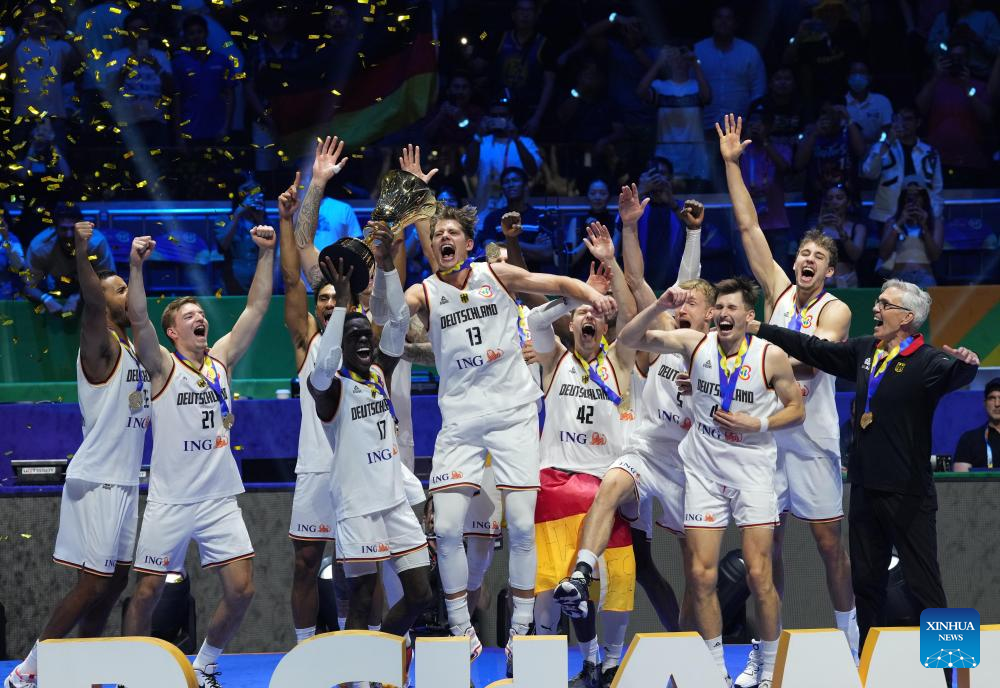 Players of Germany celebrate after winning the final between Germany and Serbia at the 2023 FIBA World Cup in Manila, the Philippines, Sept. 10, 2023. (Xinhua/Meng Yongmin)
