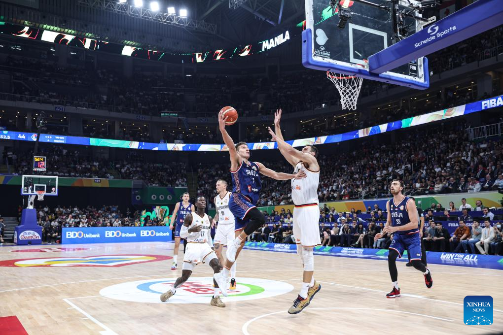 Bogdan Bogdanovic (C) of Serbia goes up for a basket during the final between Germany and Serbia at the 2023 FIBA World Cup in Manila, the Philippines, Sept. 10, 2023. (Xinhua/Wu Zhuang)