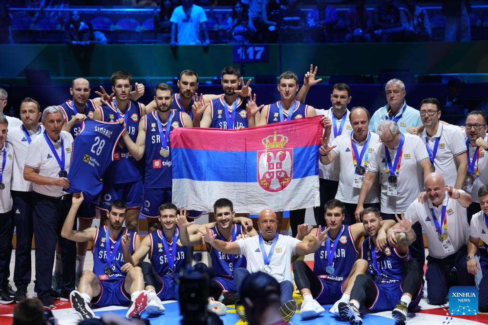 Team Serbia pose for photos during the awarding ceremony after the final between Germany and Serbia at the 2023 FIBA World Cup in Manila, the Philippines, Sept. 10, 2023. (Xinhua/Meng Yongmin)