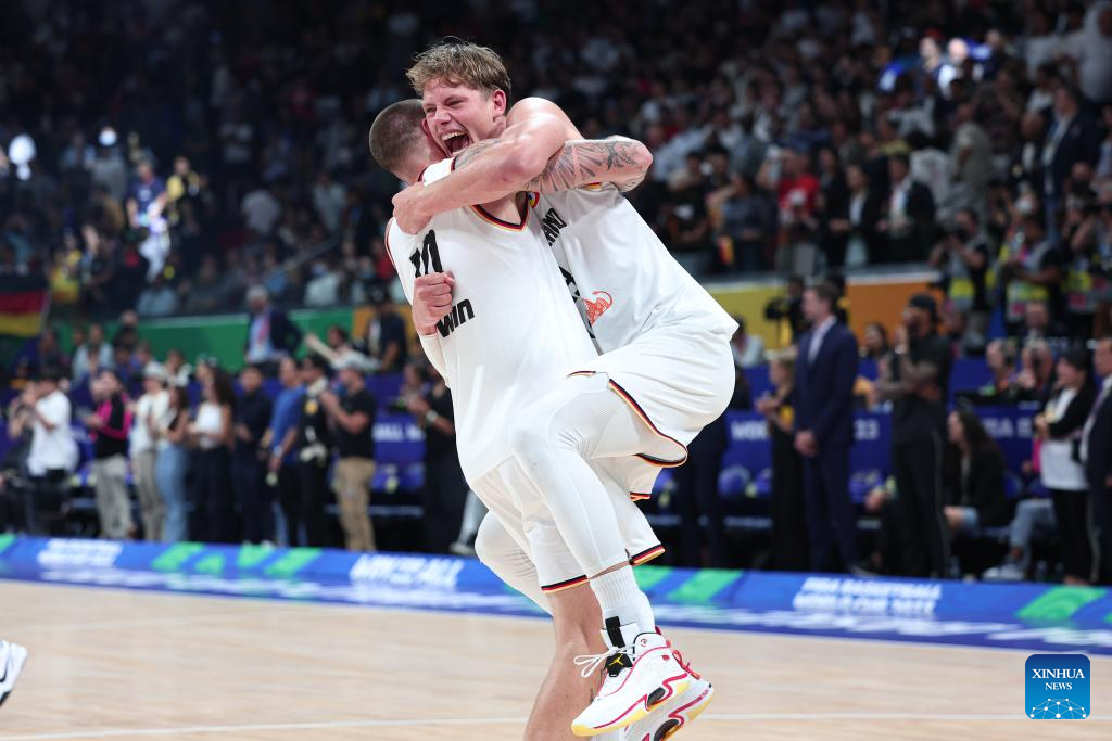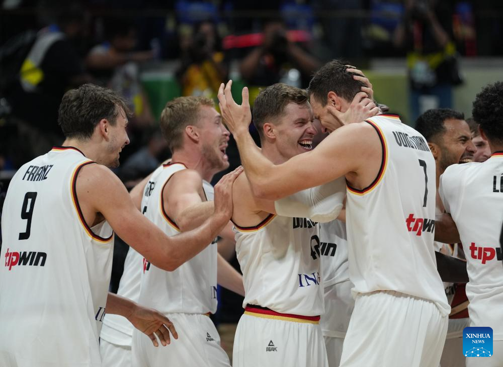 Franz Wagner (C) of Germany celebrates after the final between Germany and Serbia at the 2023 FIBA World Cup in Manila, the Philippines, Sept. 10, 2023. (Xinhua/Wu Zhuang)