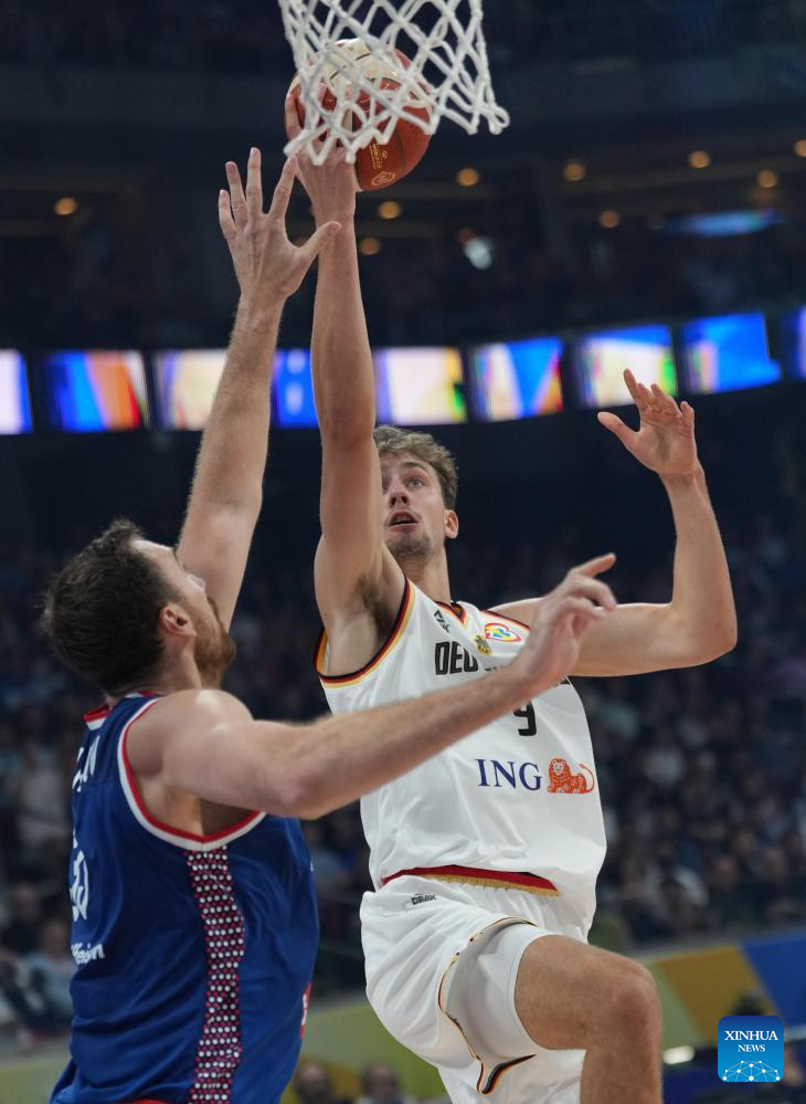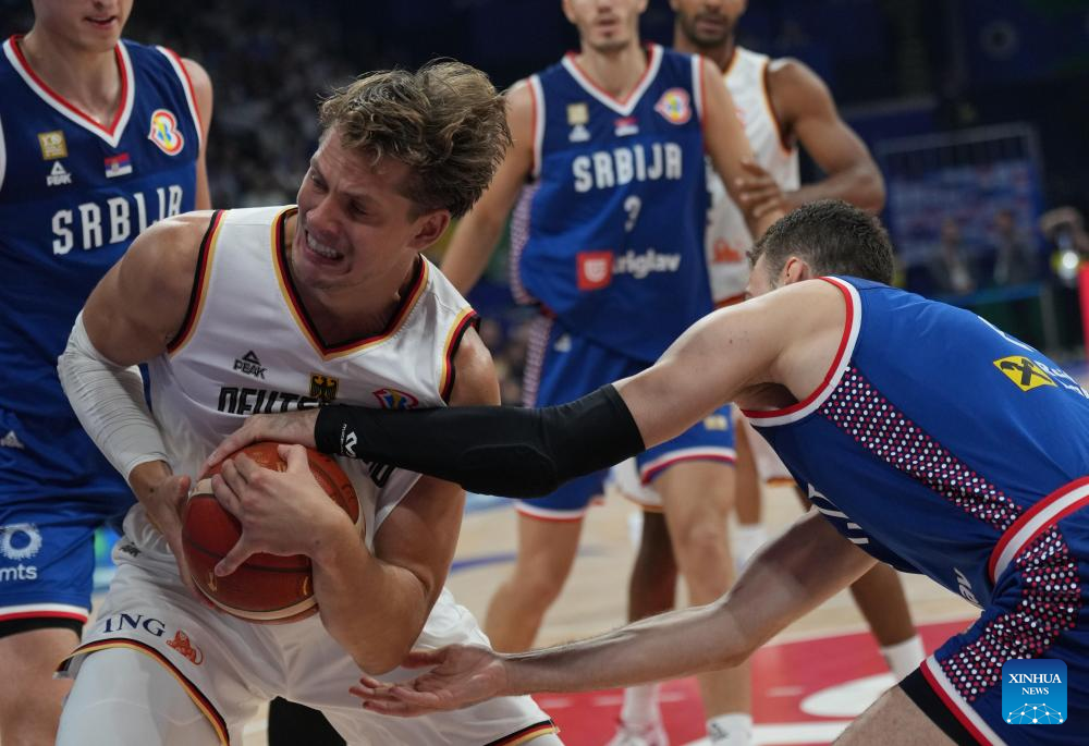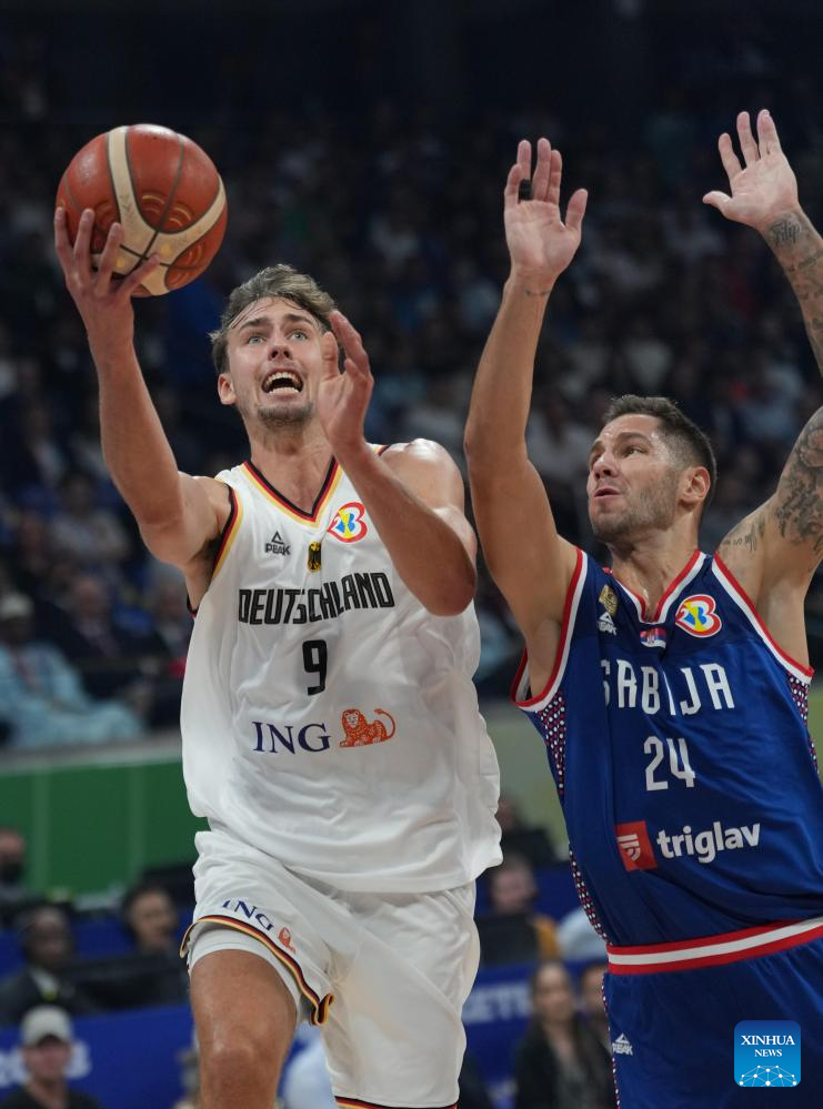 Moritz Wagner (L) of Germany competes during the final between Germany and Serbia at the 2023 FIBA World Cup in Manila, the Philippines, Sept. 10, 2023. (Xinhua/Meng Yongmin)