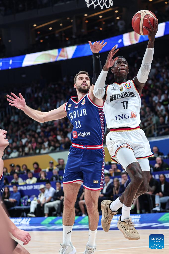 Dennis Schroder (L) of Germany breaks through during the final between Germany and Serbia at the 2023 FIBA World Cup in Manila, the Philippines, Sept. 10, 2023. (Xinhua/Meng Yongmin)