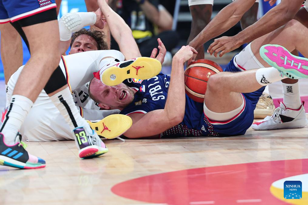Daniel Theis (L) of Germany loses balance during the final between Germany and Serbia at the 2023 FIBA World Cup in Manila, the Philippines, Sept. 10, 2023. (Xinhua/Wu Zhuang)
