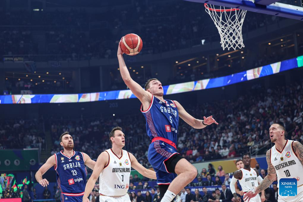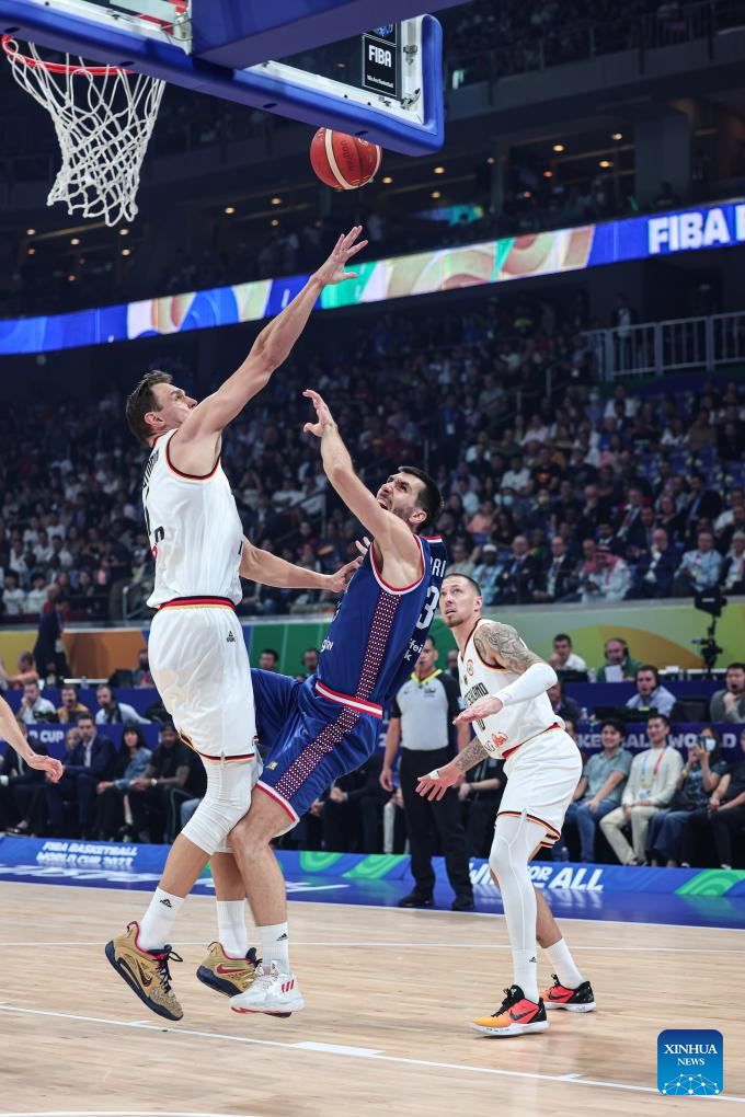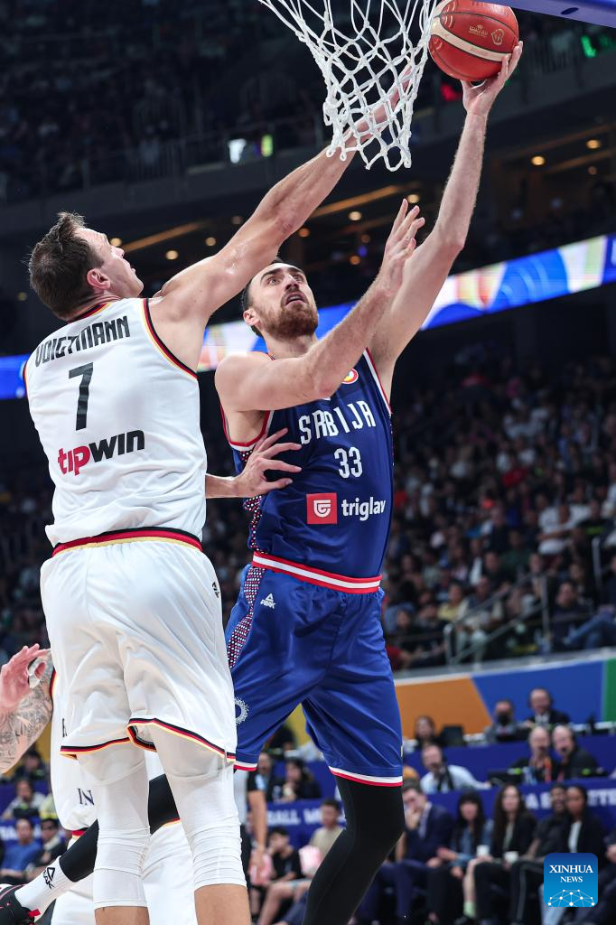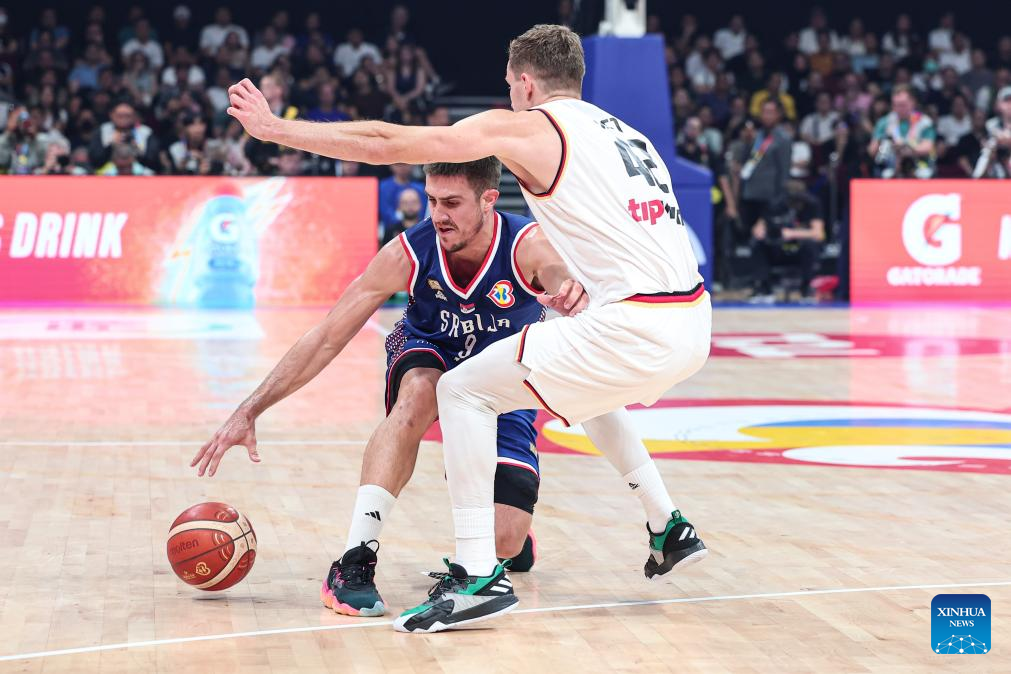 Ognjen Dobric (C) of Serbia is blocked during the final between Germany and Serbia at the 2023 FIBA World Cup in Manila, the Philippines, Sept. 10, 2023. (Xinhua/Wu Zhuang)