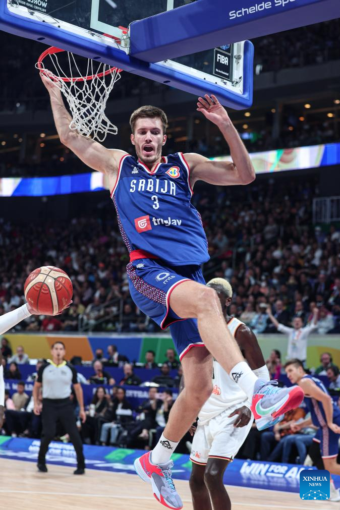 Filip Petrusev of Serbia dunks during the final between Germany and Serbia at the 2023 FIBA World Cup in Manila, the Philippines, Sept. 10, 2023. (Xinhua/Wu Zhuang)