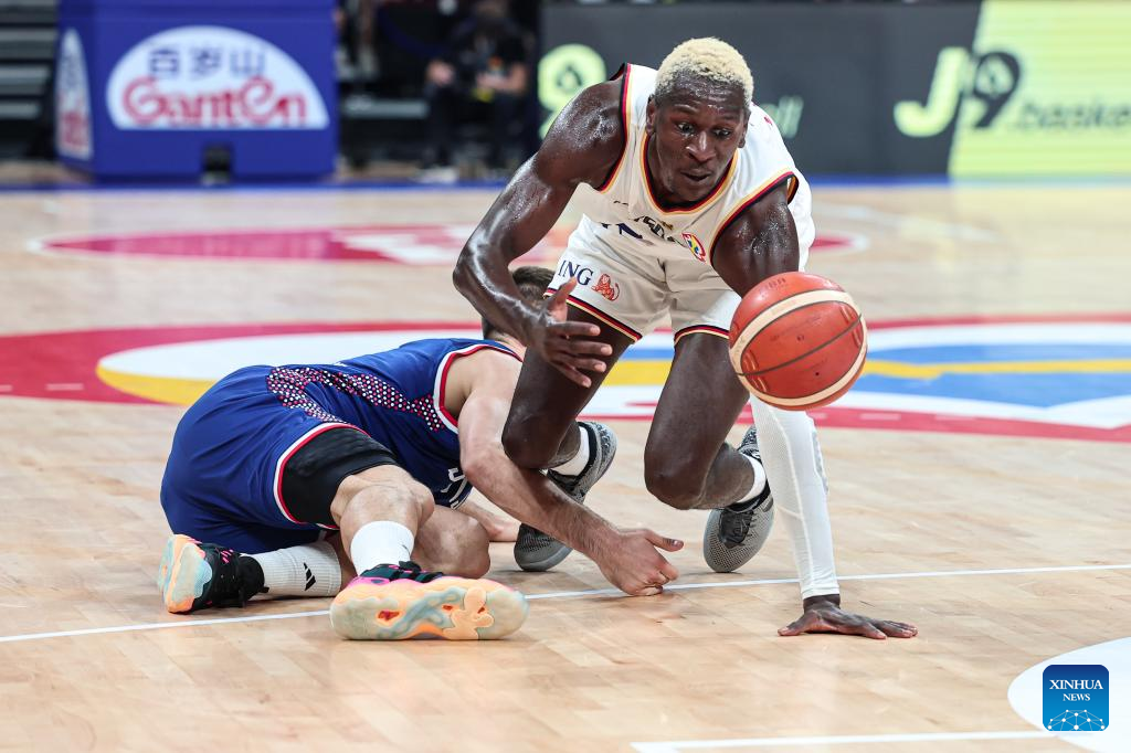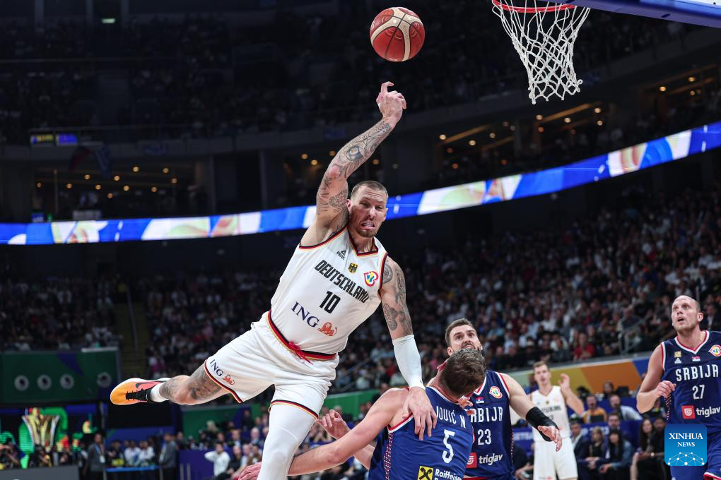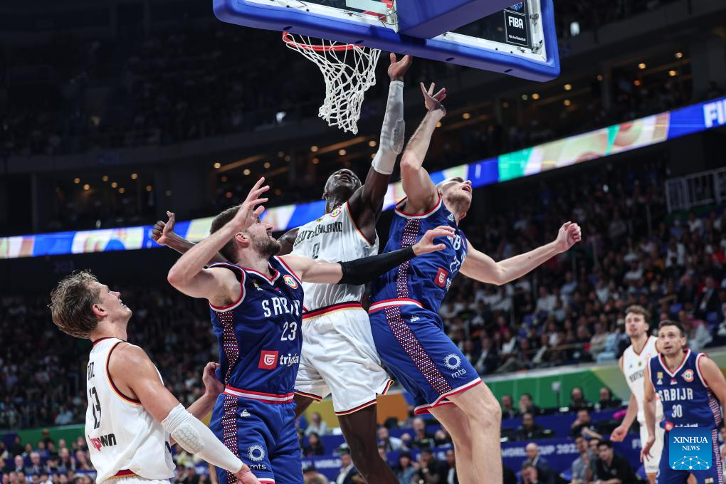 Isaac Bonga (3rd L) of Germany vies for the ball during the final between Germany and Serbia at the 2023 FIBA World Cup in Manila, the Philippines, Sept. 10, 2023. (Xinhua/Wu Zhuang)