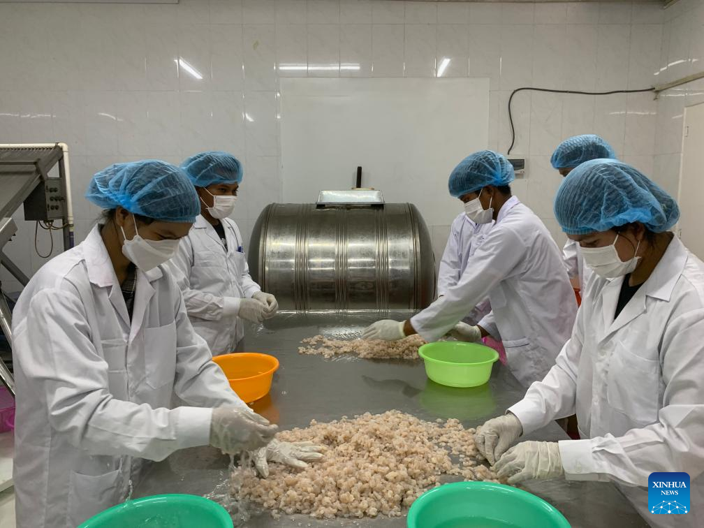 Workers peel shrimps at a factory in Phnom Penh, Cambodia on Sept. 7, 2023. Cambodia on Thursday exported its first batch of wild aquatic products directly to China, marking another fruitful cooperation between the two countries in the fisheries sector. (Photo by Van Pov/Xinhua)