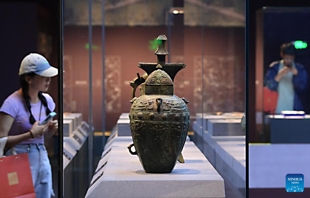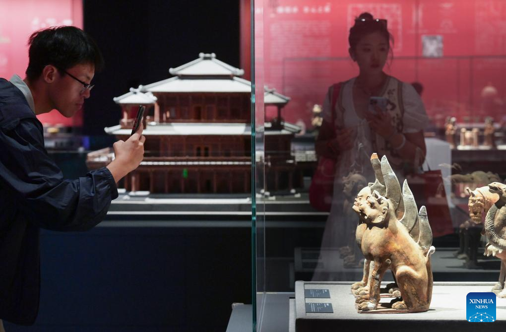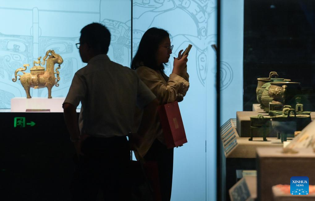A visitor takes photos of exhibits at the Chinese Archaeological Museum in Beijing, capital of China, Sept. 15, 2023. The Chinese Archaeological Museum was opened to the public on Friday. (Xinhua/Li He)