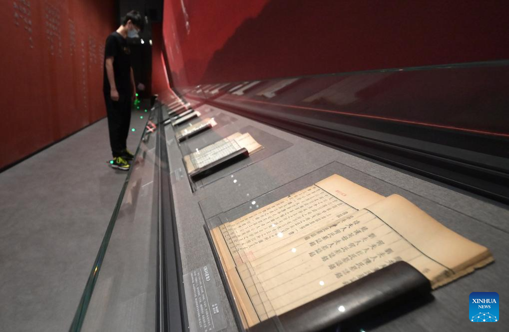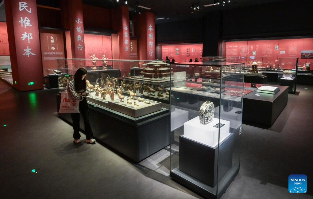 A visitor looks at exhibits displayed at the Chinese Archaeological Museum in Beijing, capital of China, Sept. 15, 2023. The Chinese Archaeological Museum was opened to the public on Friday. (Xinhua/Li He)
