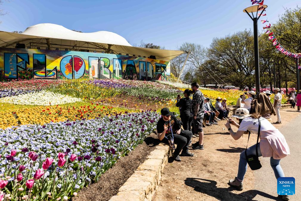 People enjoy the Floriade flower festival at the Commonwealth Park in Canberra, Australia, Sept. 16, 2023. Floriade, one of the Australian Capital Territory's signature events, is held here from Sept. 16 to Oct. 15. (Photo by Chu Chen/Xinhua)