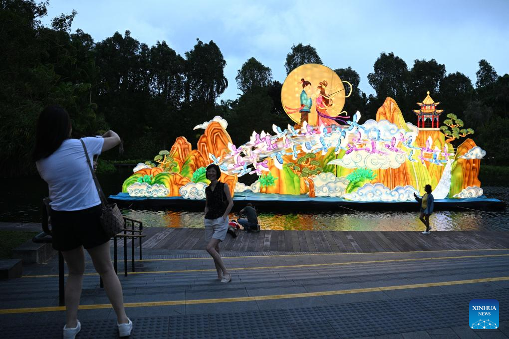 Tourists take photos on the Mid-Autumn Festival lantern display held at Singapore's Gardens by the Bay on Sept. 21, 2023. (Photo by Then Chih Wey/Xinhua)
