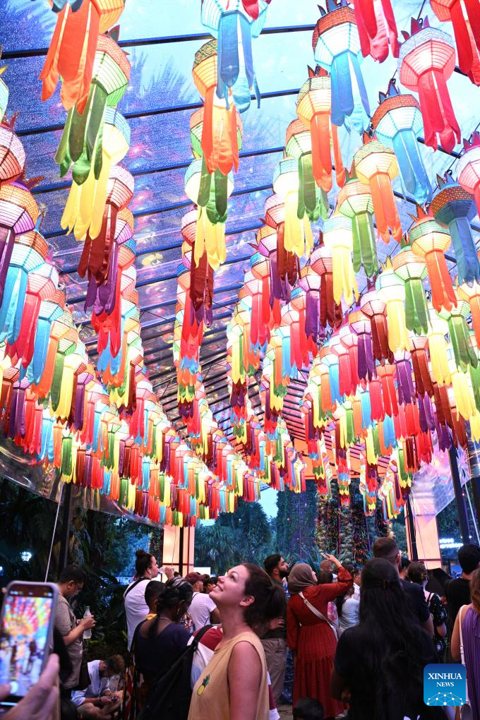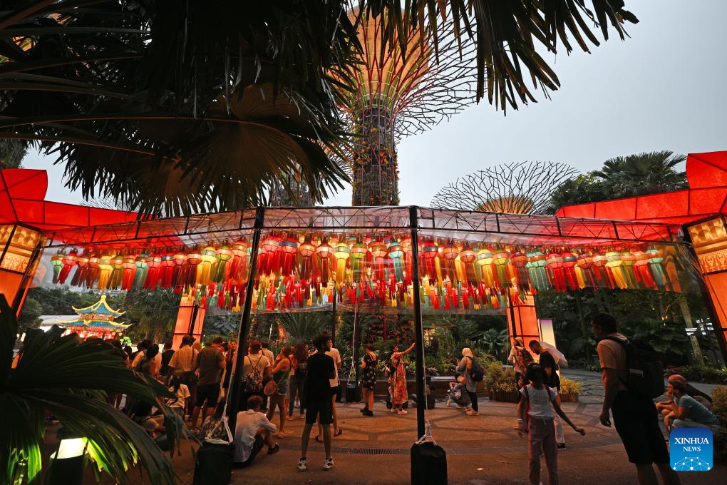 People visit the Mid-Autumn Festival lantern display held at Singapore's Gardens by the Bay on Sept. 21, 2023. (Photo by Then Chih Wey/Xinhua)