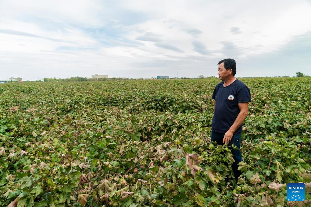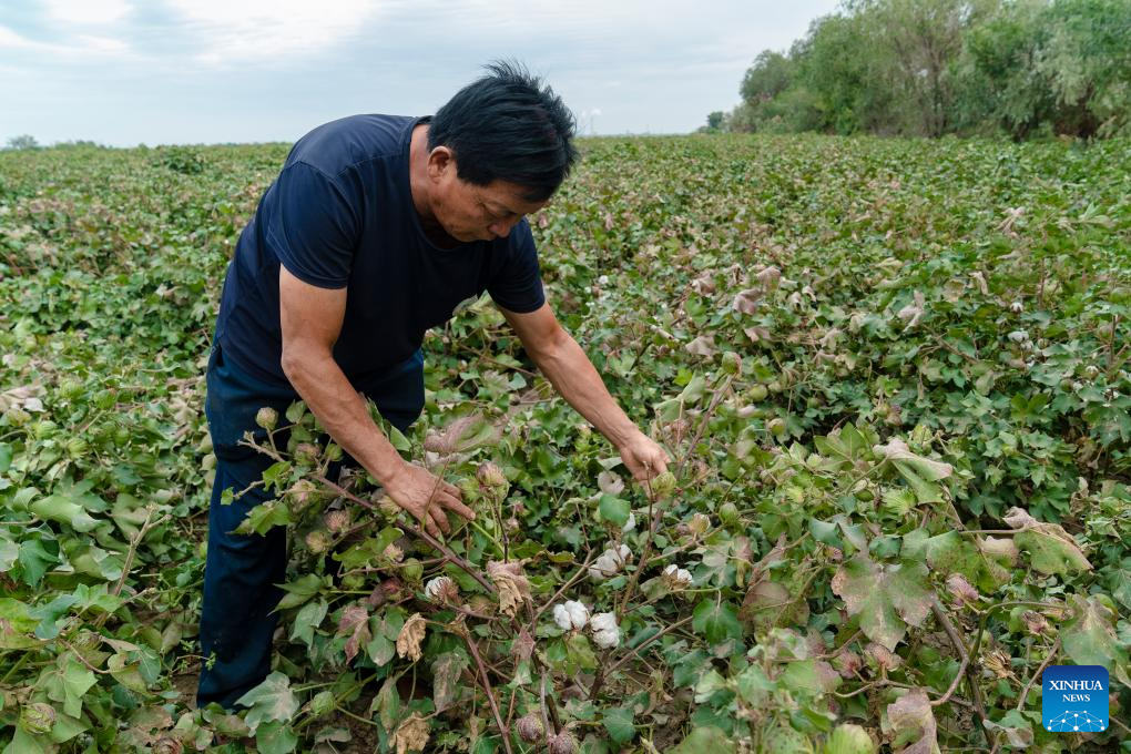 Cotton farmer Gong Lunquan checks the growth of cotton in a cotton field near Urumqi, northwest China's Xinjiang Uygur Autonomous Region, Sept. 14, 2023. (Xinhua/Zhou Shengbin)