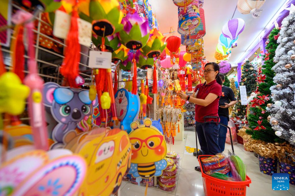 People buy decorations for the upcoming Mid-Autumn Festival in Kuala Lumpur, Malaysia, Sept. 23, 2023. The upcoming Mid-Autumn Festival features prominently in multicultural Malaysia, with the overseas Chinese and their local friends enthusiastically marking the key cultural date.(Photo by Chong Voon Chung/Xinhua)