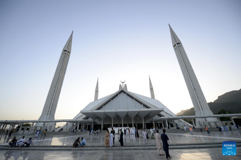 Tourists visit the Faisal Mosque in Islamabad, capital of Pakistan, on Sept. 26, 2023. (Xinhua/Ahmad Kamal)