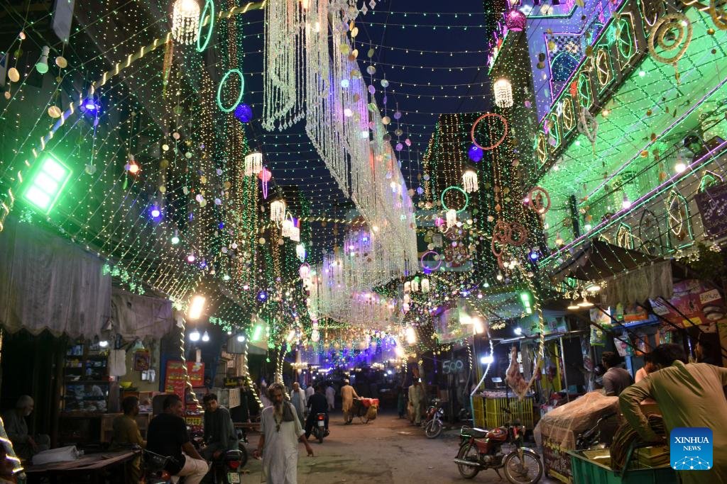 Photo taken on Sept. 28, 2023 shows a street illuminated to celebrate Eid-e-Milad-un-Nabi, the birthday of Islam's Prophet Muhammad, in Lahore, Pakistan. (Photo by Sajjad/Xinhua)
