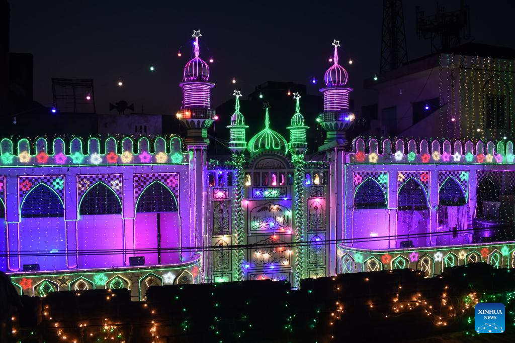 Photo taken on Sept. 28, 2023 shows a mosque illuminated to celebrate Eid-e-Milad-un-Nabi, the birthday of Islam's Prophet Muhammad, in Lahore, Pakistan. (Photo by Sajjad/Xinhua)