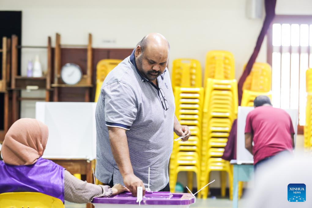 A voter casts his vote at a polling station in Male, Maldives, Sept. 30, 2023. The second round of presidential election in the Maldives kicked off on Saturday, after no candidate secured more than 50 percent of votes in the first round to win outright. (Xinhua)