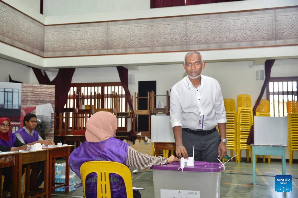 Mohamed Muizzu casts his vote at a polling station in Male, Maldives, Sept. 30, 2023. Mohamed Muizzu, candidate of the coalition of Progressive Party of Maldives (PPM) and People's National Congress (PNC), emerged as the winner in the runoff presidential election in the Maldives on Saturday, according to preliminary results compiled by local media. (Sun Online/Handout via Xinhua)